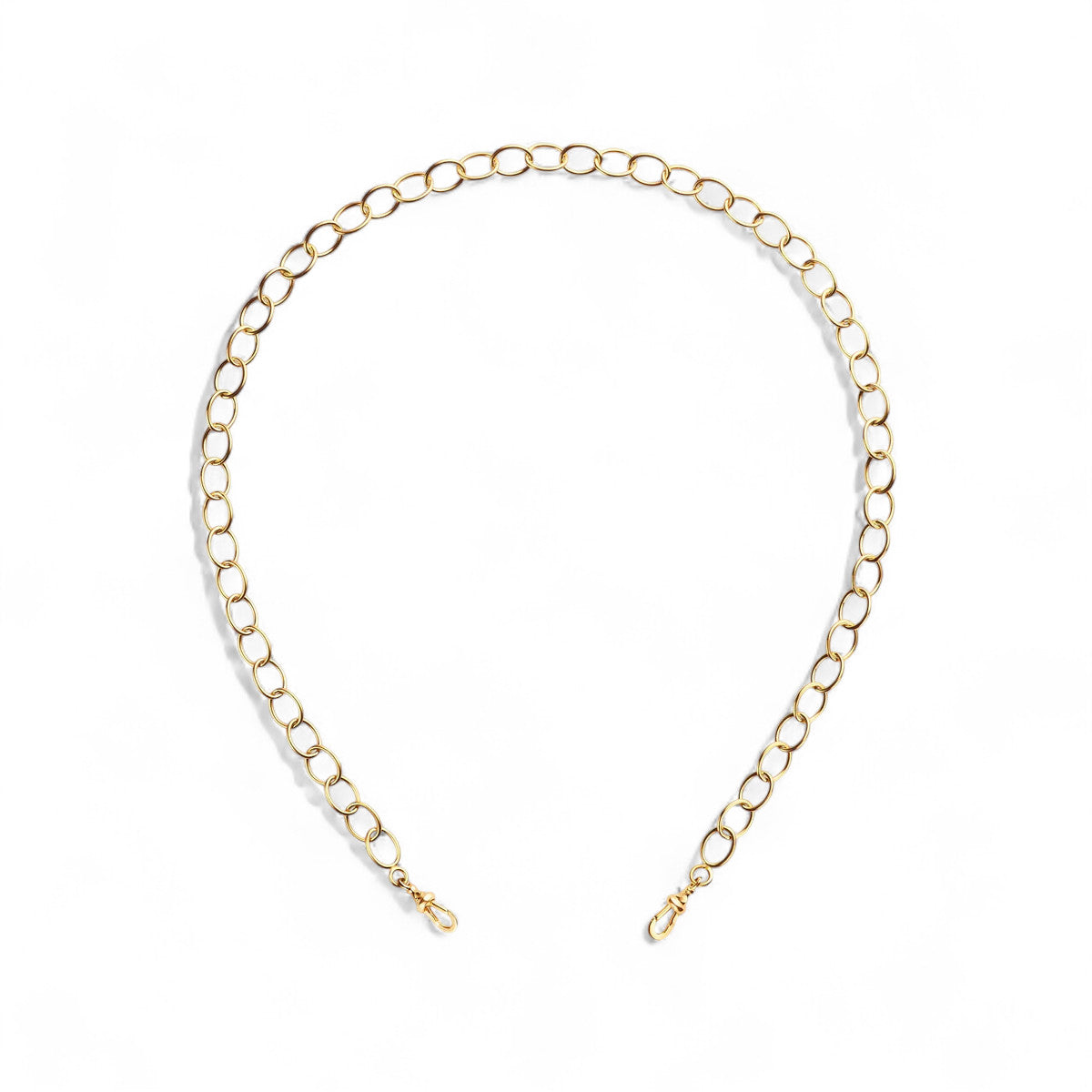 This elegant 37cm chain by Marie Lichtenberg features delicate smooth gold rosa micro links and refined gold handcuff clasps on both ends. Its versatile design allows you to wear it solo for a subtle statement or pair it with one of Marie’s exquisite lockets or scapulars, adding a timeless touch to any ensemble.