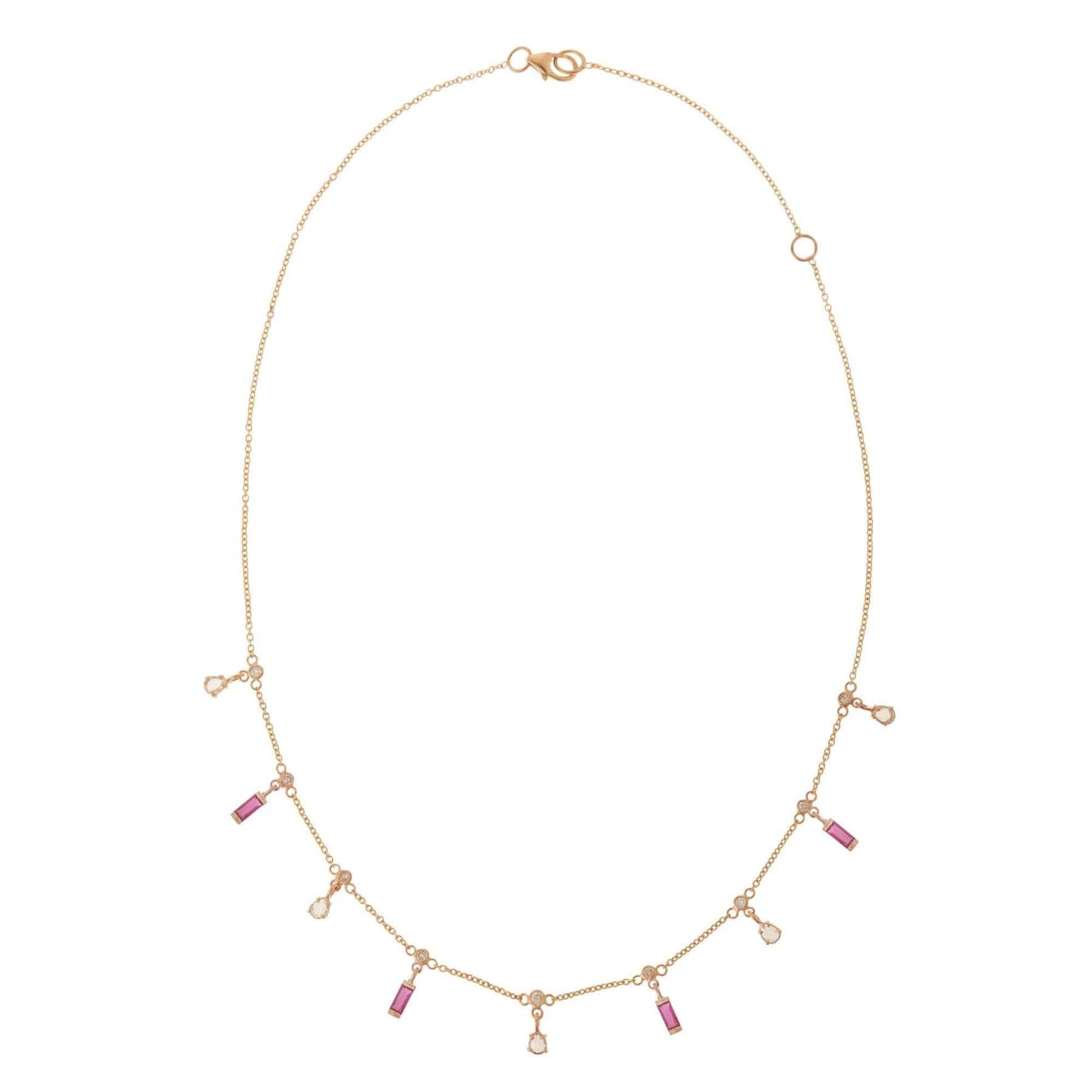 Awaken a whimsical elegance with Ileana Makri's one-of-a-kind Ruby Drops Necklace. The luxurious 14k rose gold chain is adorned with dazzling white diamonds and ruby baguettes that evoke the image of lush grasses blowing gracefully in the wind. An exquisite touch to any ensemble, this handmade piece provides an exclusive and timeless allure.