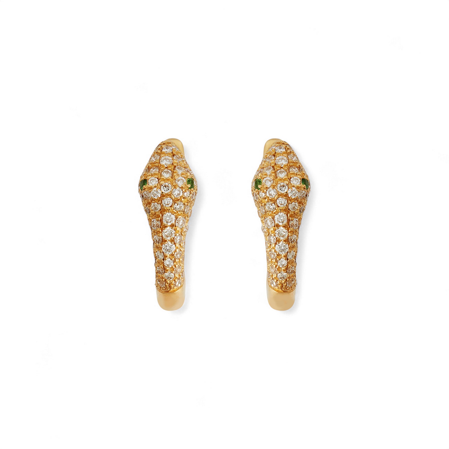 Delicate and enchanting, these Baby Boa Huggies earrings are a refined interpretation of nature’s elegance. Their petite size and snake-inspired design make them a perfect touch of understated charm. The shimmering white diamonds and vivid green tsavorites add a captivating detail, reminiscent of the boa’s striking eyes. Lightweight and dainty, these earrings feature a secure post-back closure for pierced ears, offering subtle sophistication for everyday wear or special occasions.