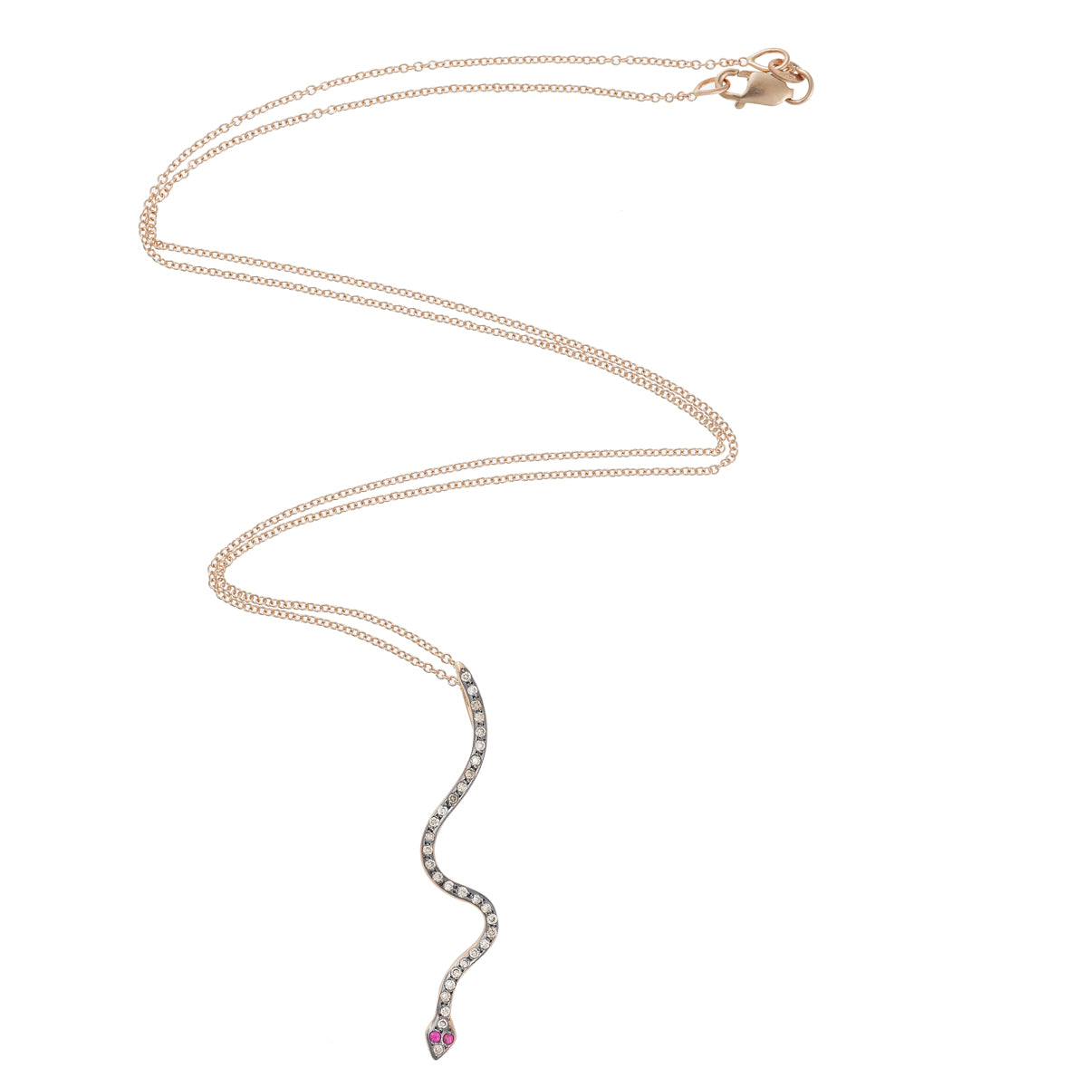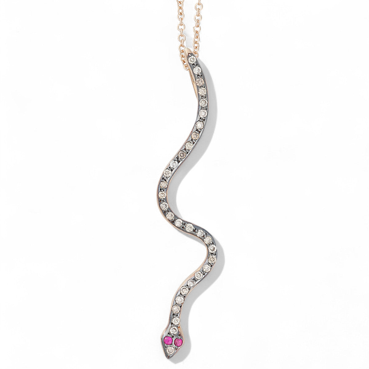 The Lucky Snake Ember Pendant by Ileana Makri radiates with the quiet glow of refined fire. Handcrafted from polished 18k rose gold and adorned with pavé champagne diamonds and ruby eyes, this elegant piece captures the warmth of smouldering embers in precious form. The subtle oxidation enriches the stones’ hue, enhancing the pendant’s rich, luminous allure. Wear it alone for a touch of understated sophistication, or layer it to elevate any ensemble.