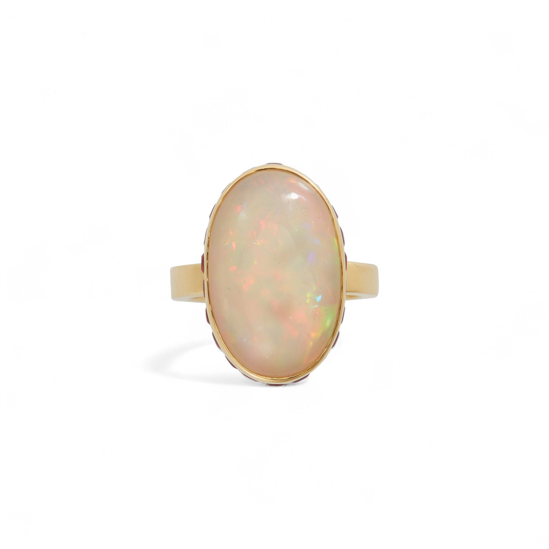 A luminous celebration of color and craftsmanship, the “Solar Mirage” ring features an exceptional Ethiopian opal set in polished 18k yellow gold. The opal’s soft, ethereal glow shifts with flashes of green, gold, and rose, capturing the mystery of light through a desert haze. The bezel is bordered with a band of princess-cut orange sapphires—meticulously set and perfectly faceted to bring warmth, intensity, and architectural precision to this otherwise fluid composition. Sculptural, rare, and unapologetically bold, this is a true collector’s piece.