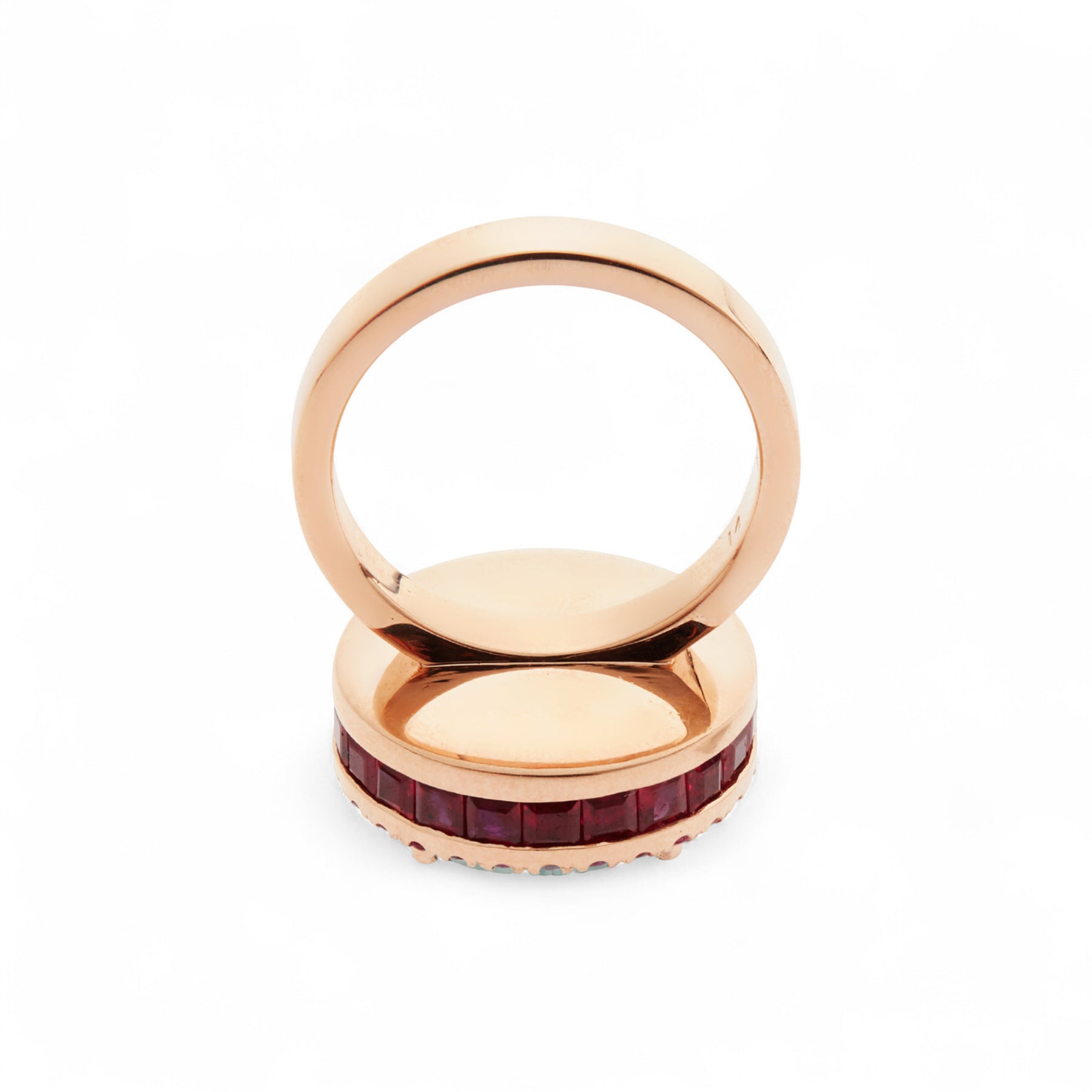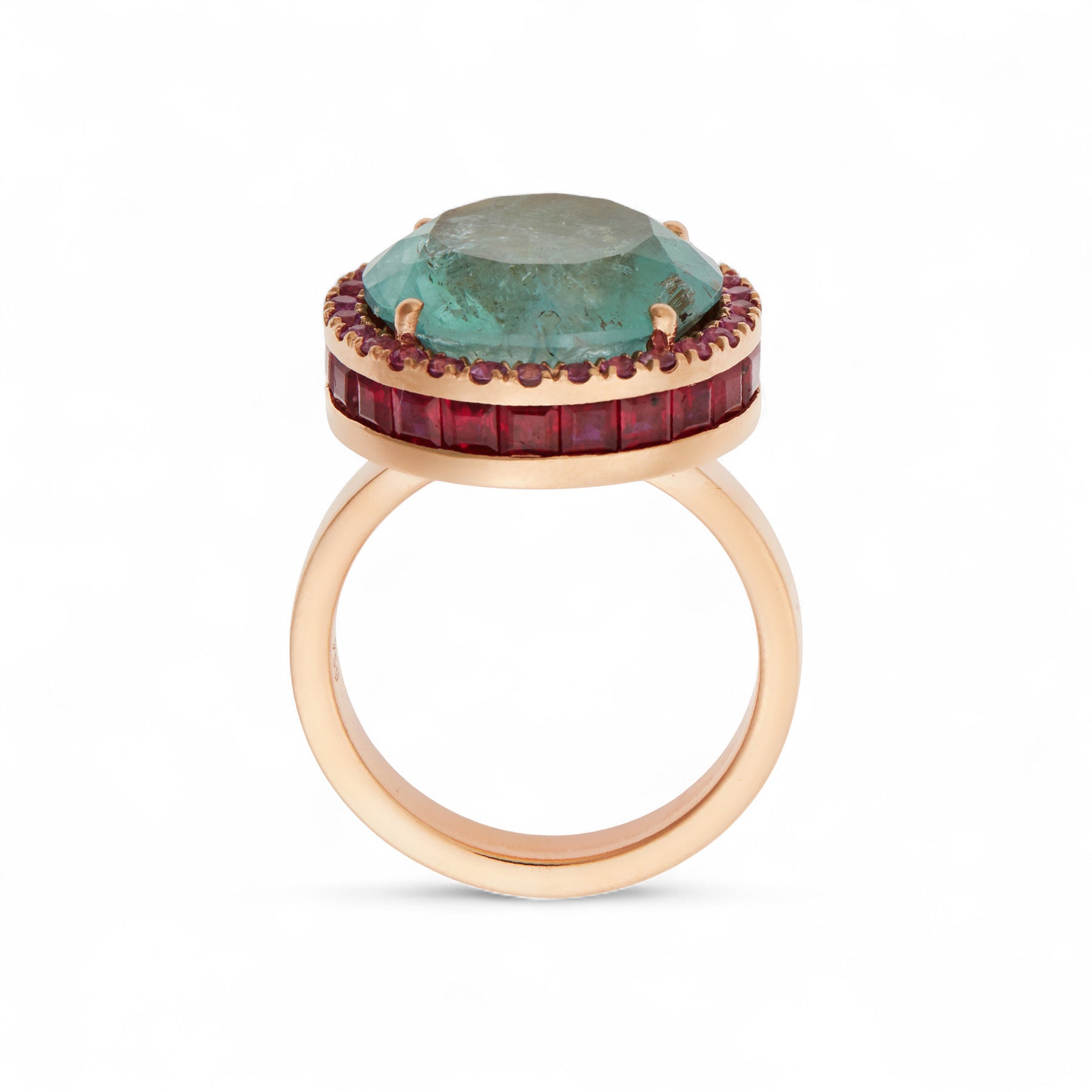 Enchanting and timeless, the Delight Eternity Flower Ring is crafted from 18k rose gold, featuring an Aquamarine centrepiece, embellished with a halo of light-catching Pink Sapphires and further detailed around the side with square-cut Rubies. Truly an exquisite piece of art.