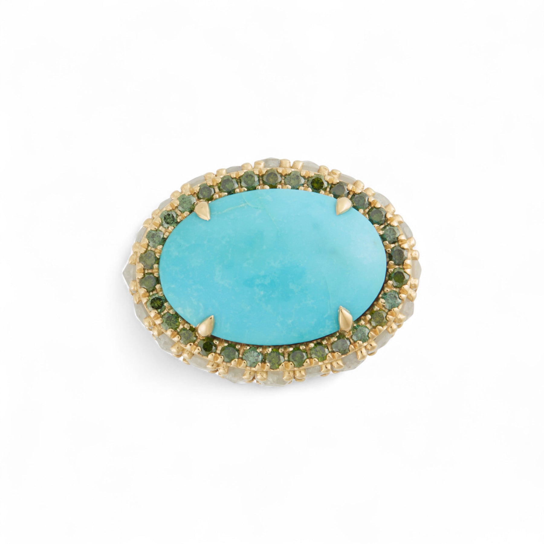 A tribute to nature’s quiet miracles, the Desert Bloom Ring features an oval turquoise cabochon, radiant in soft sky-blue. Surrounded by a halo of green diamonds and a second row of glimmering rose-cut diamonds, the setting evokes the lush surprise of life flourishing in arid beauty. Crafted in 18K yellow gold, this ring is both grounding and luminous — a true oasis for the hand.
