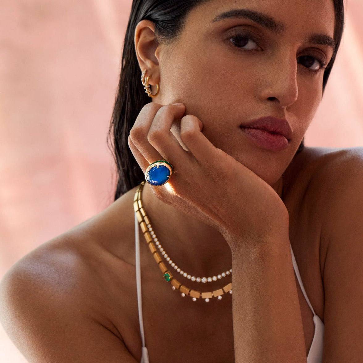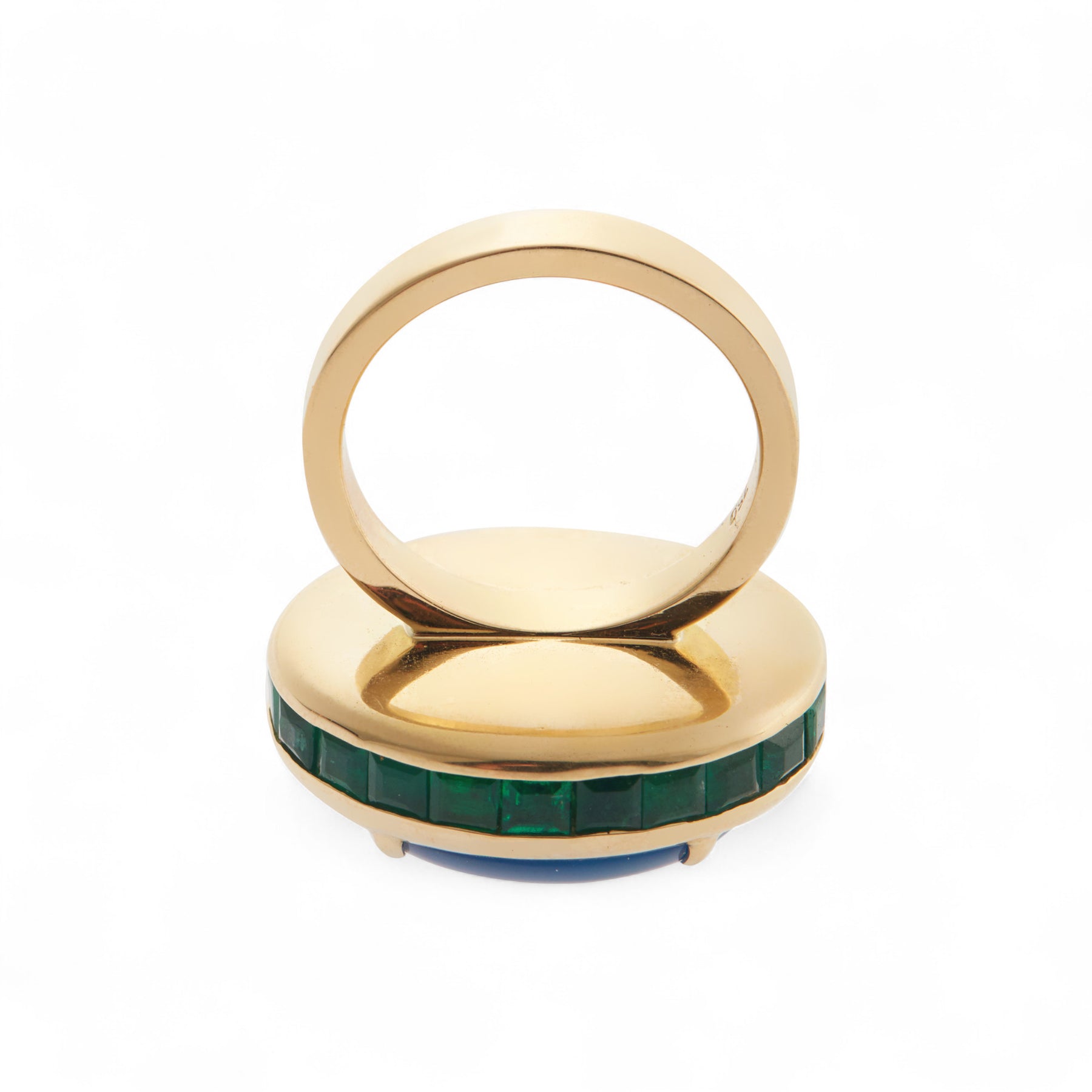 This unique Emerald Sea Ring, crafted from 18k yellow gold, evokes luxurious elegance with a Blue Opal center and sparkling emeralds encircling the band. Capture the glamour and romance of the 1920's with this timeless one-of-a-kind piece.