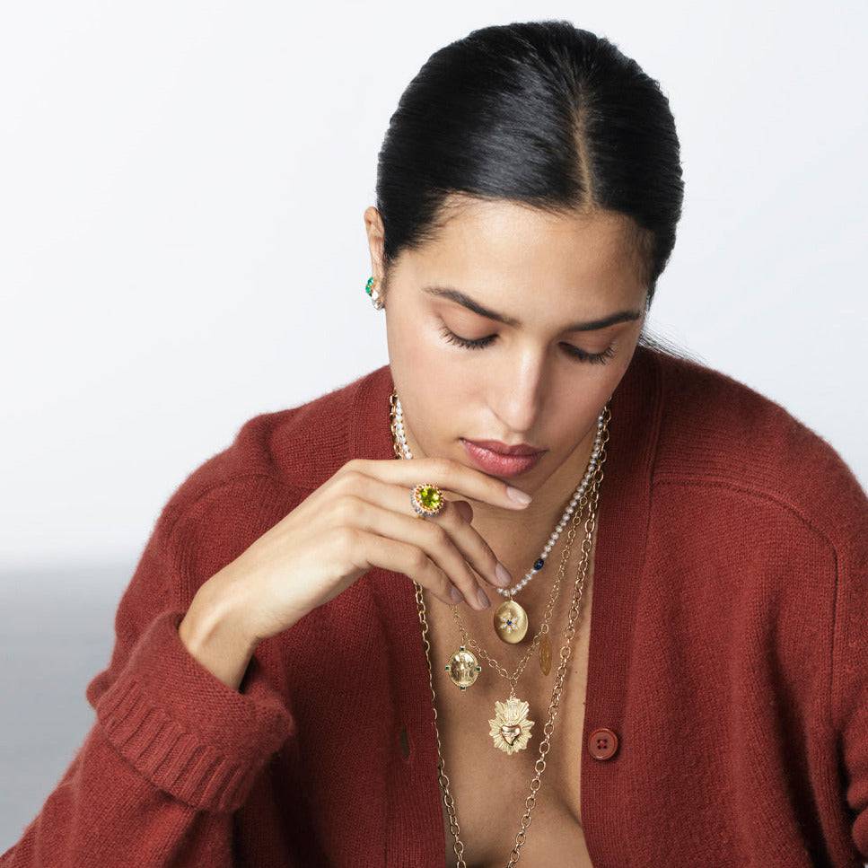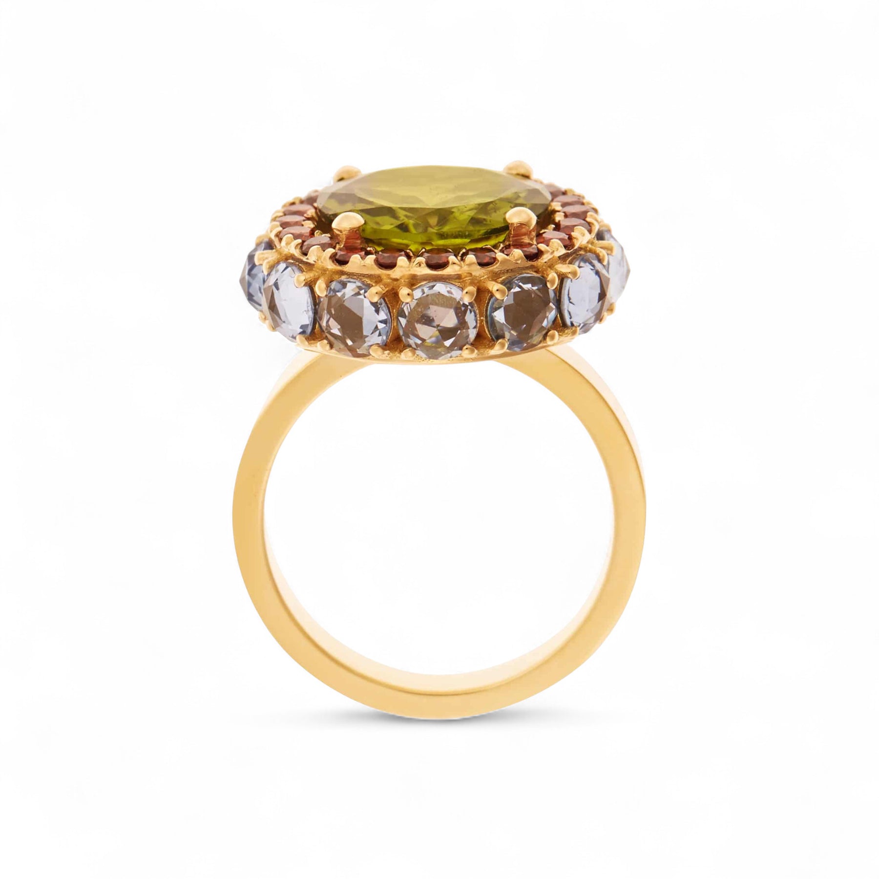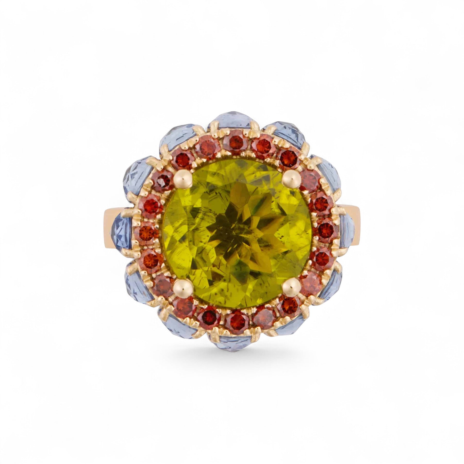 This Hope Eternity Flower Ring is a unique piece that captures the elegance and allure of 1920s cocktail jewelry. Its 18k yellow gold setting is set off by a lustrous peridot in the center, further enhanced with a halo of orange diamonds and rosecut blue sapphires, creating a mesmerizing work of art. For the discerning collector of luxury jewelry, this one-of-a-kind piece is sure to be a dazzling addition to any collection.