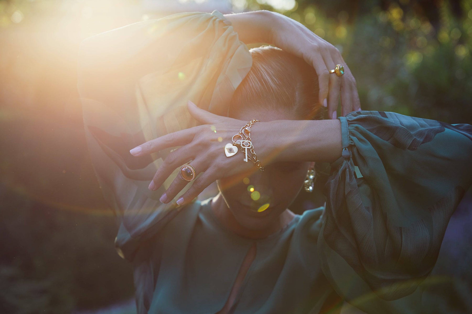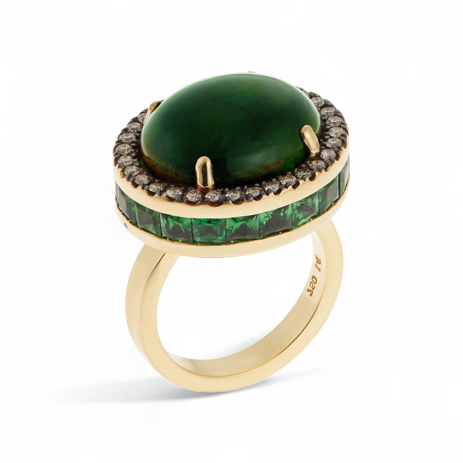 This breathtaking Bespoke ring is inspired by the glamour and romance of the cocktail jewelry of the 1920's. Hand-cast from 18k yellow gold, This one of a kind piece is centered with a deep green Opal, accented with sparkling brown diamonds in an oxidized setting and square emeralds all around the rim.