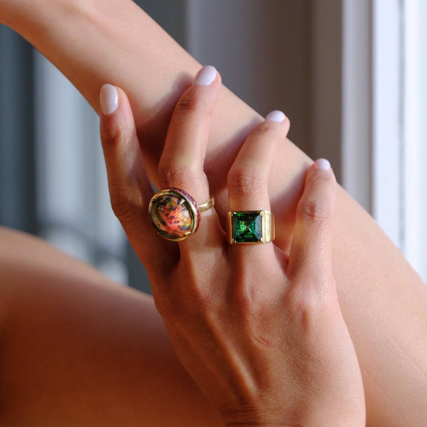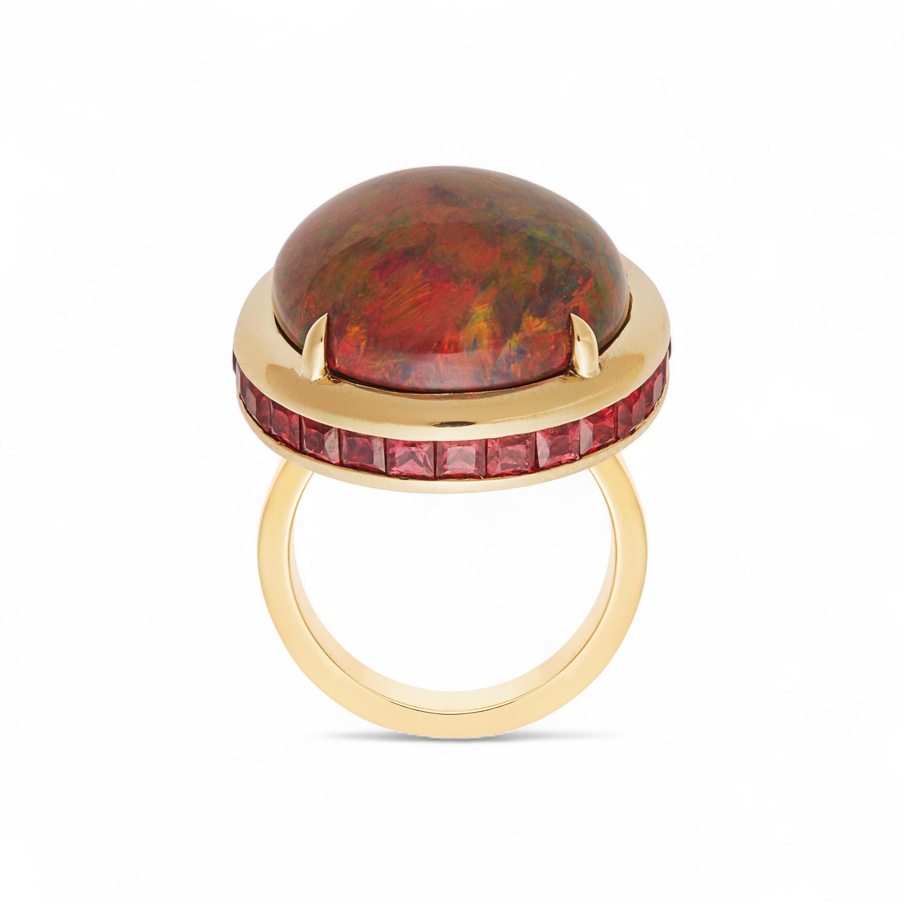 This exquisite opal passion ring is beautifully crafted from 18k yellow gold and set with an iridescent opal surrounded with stunning orange square-cut sapphires. Inspired by the glamour and romance of the 1920's, this one-of-a-kind ring is sure to add an enchanting sparkle to your collection.