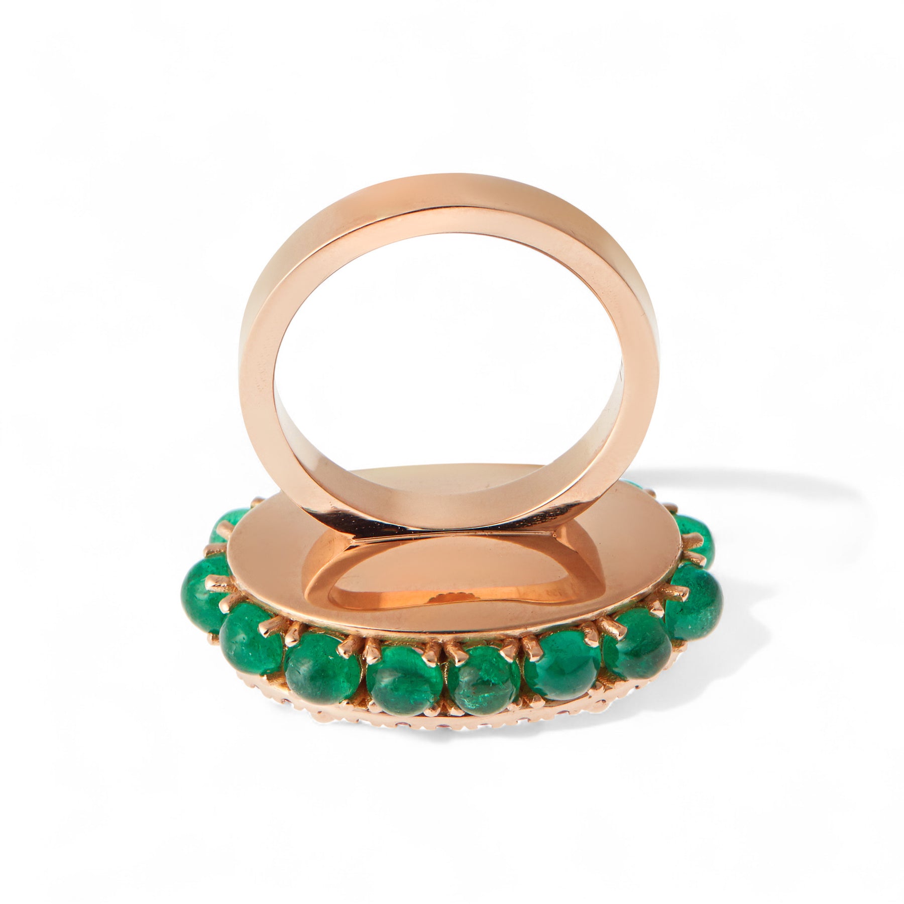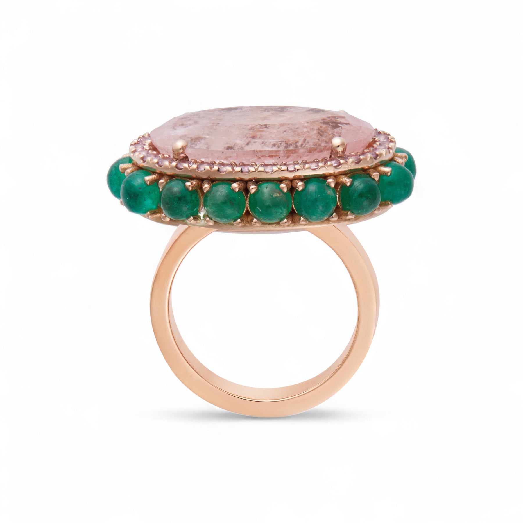 This Unique ring is inspired by the glamour and romance of the cocktail jewelry of the 1920's. Hand-cast from 18k yellow gold, This one of a kind piece is centered with a Morganite, accented with a halo of pink sapphires and adorned all around the side with cabochon emeralds.