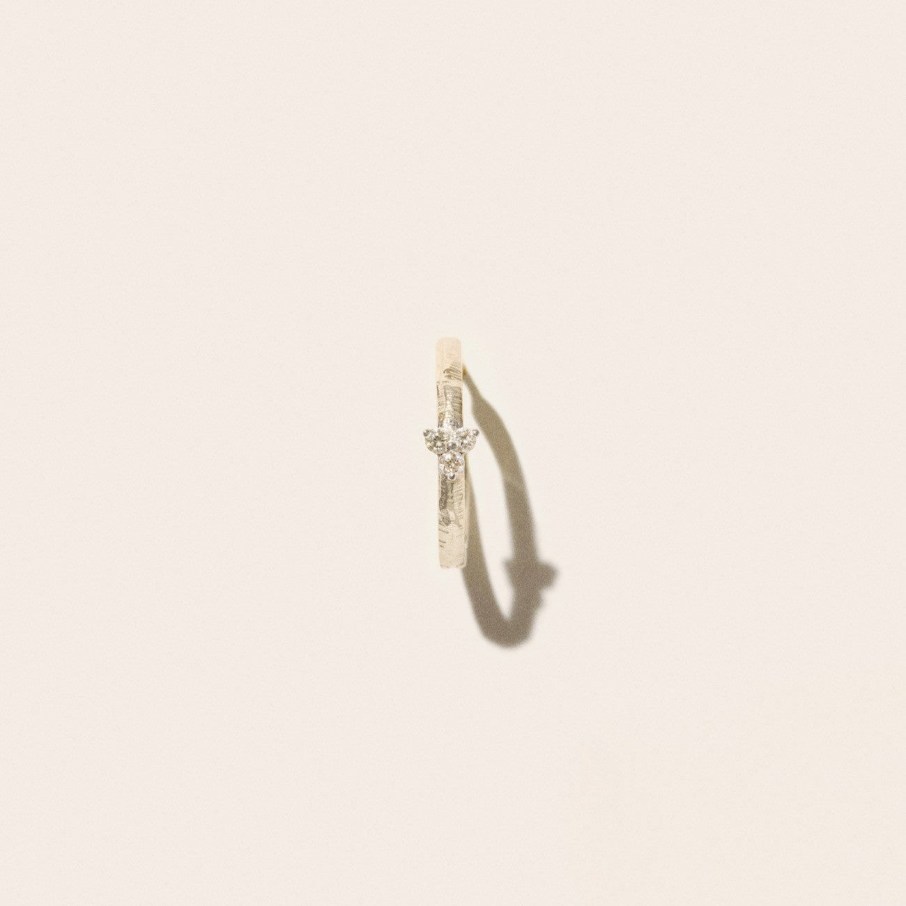 The Gaby N°2 Earring captures the essence of luminous movement through textured artistry. Handcrafted in 9k yellow gold, its refined hoop silhouette (1.4 cm) is enhanced by the organic texture of gold leaf, shimmering with subtle radiance. A delicate cluster of diamonds sits gracefully at the front, creating a play of brilliance and fluidity with every turn. Sold individually, this versatile earring can be worn solo for understated elegance or paired for a harmonious, luminous set. Perfect for layering, it embodies the collection’s dialogue between texture, light, and timeless refinement.
