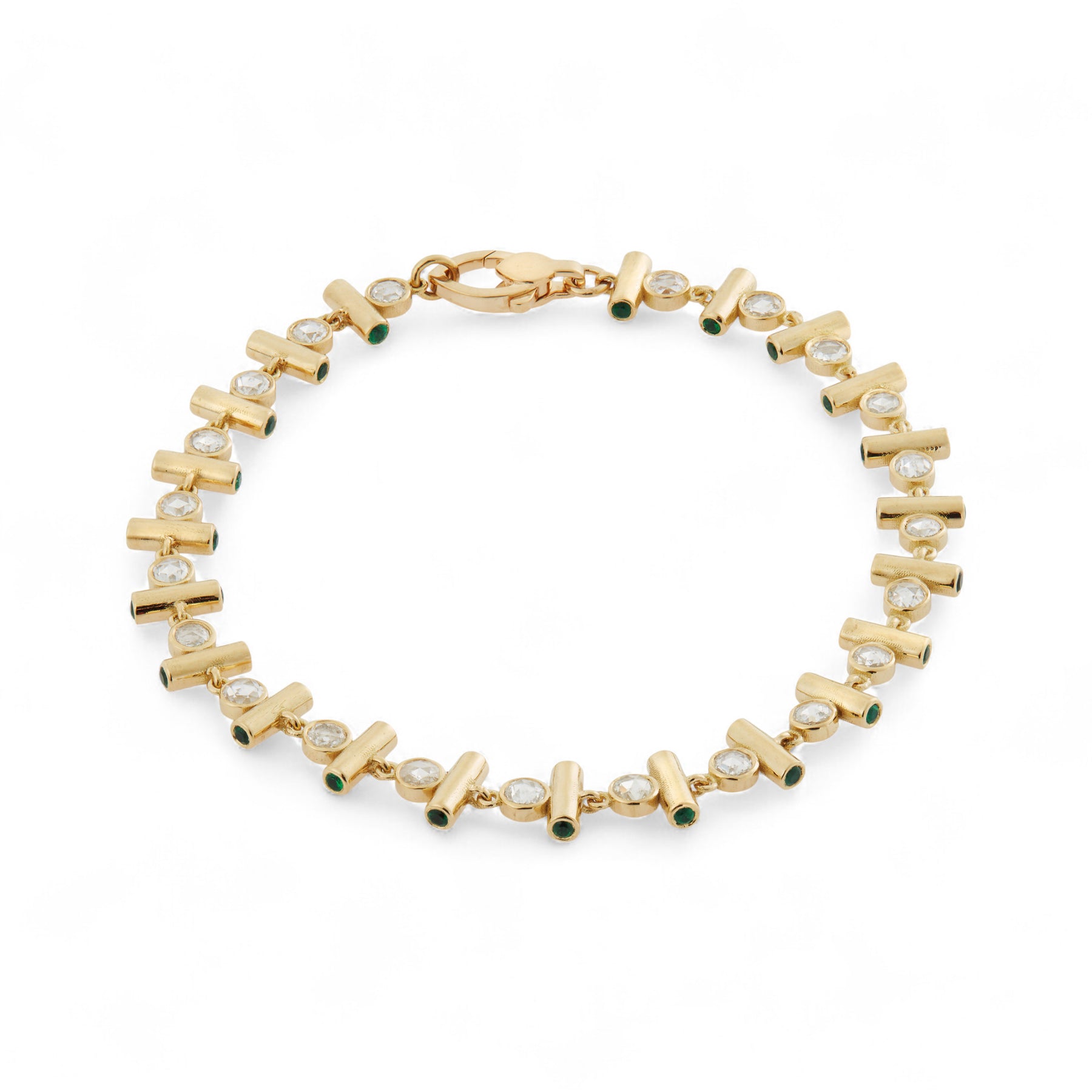 Elegant and architectural, the Emerald Edge Bracelet is crafted in 18k yellow gold and set with white rose-cut diamonds framed by polished gold bars. Each bar conceals emeralds along its sides, catching the light only as the bracelet moves. A modern study in texture and contrast — refined from every angle, playful in its hidden detail.