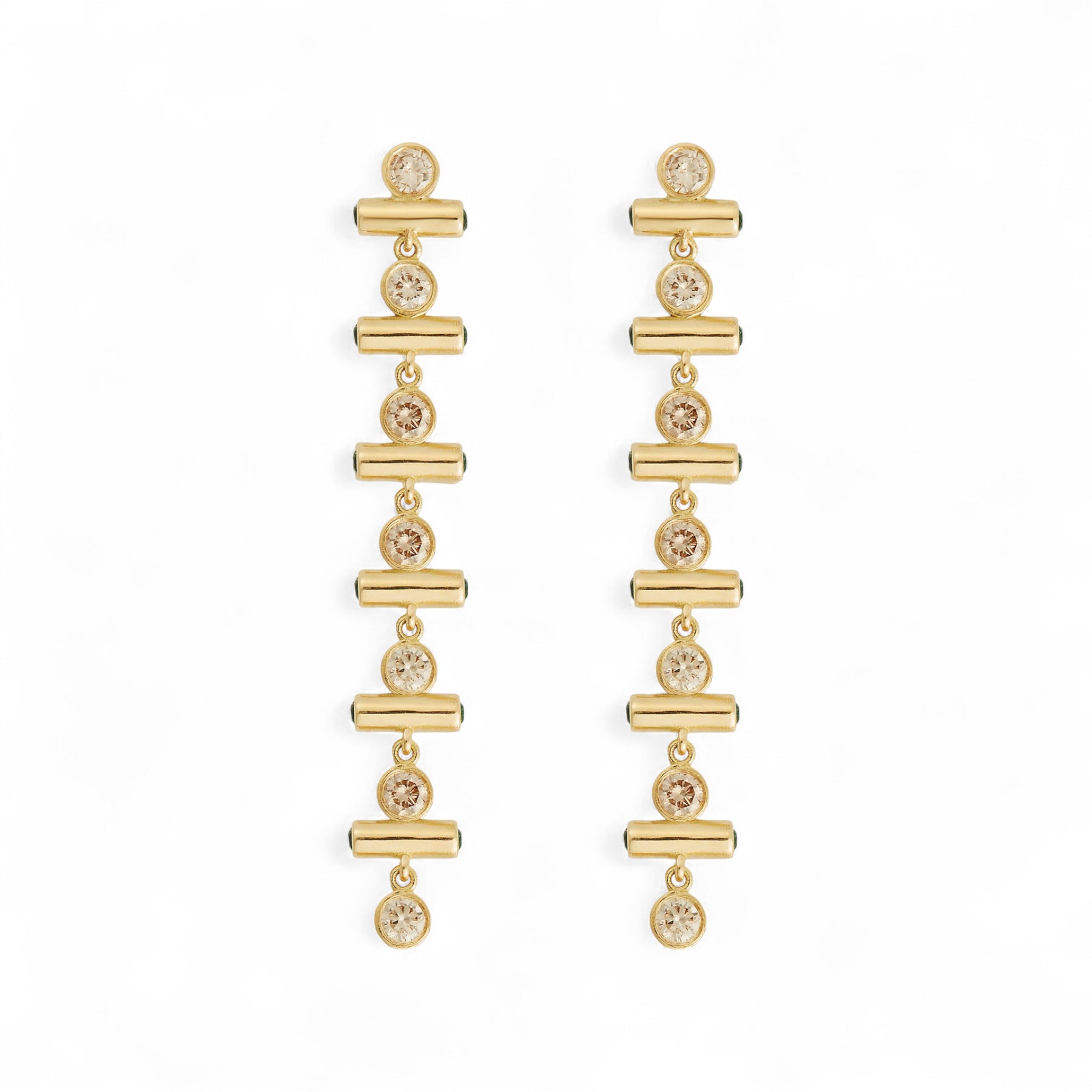 Graceful and architectural, the Emerald Edge Long Earrings combine refined geometry with hidden light. Crafted in 18k yellow gold, alternating rose-cut light champagne diamonds and polished gold bars create a fluid vertical rhythm. Each bar is inlaid with emeralds along its sides — a secret detail that catches the eye only as the earrings move. Elegant and versatile, they frame the face with a gentle play of light, color, and motion.