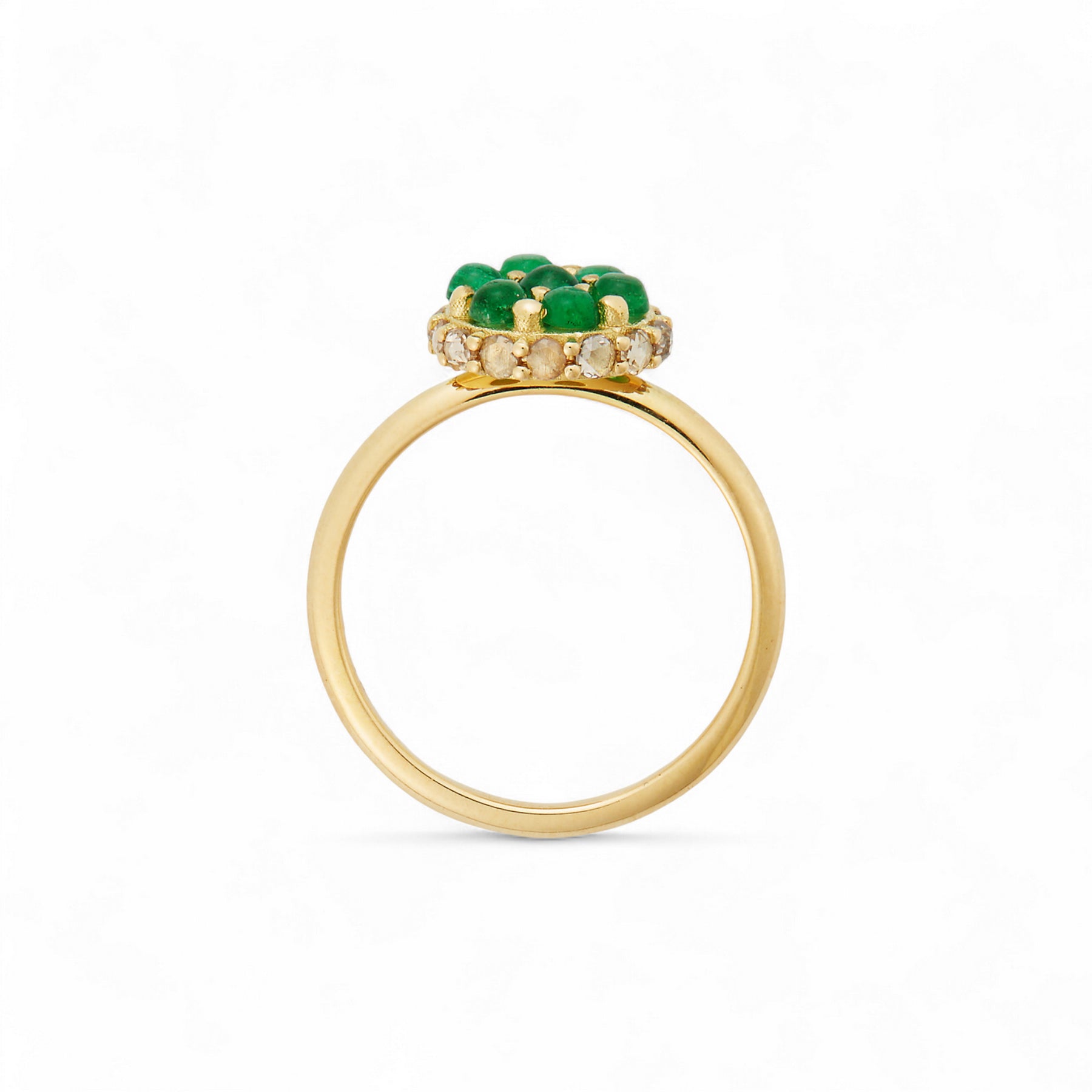 Delicate, refined, and full of quiet charm, the Emerald Mini Spin Ring brings a playful touch to everyday elegance. Handcrafted in 18k yellow gold, it features a spinning motif adorned with cabochon emeralds and rose-cut light champagne diamonds. The gentle rotation catches the light with every movement, revealing the collection’s signature rhythm and grace. Perfect worn alone or paired with the Large Emerald Spin Ring for a layered expression of motion and light.