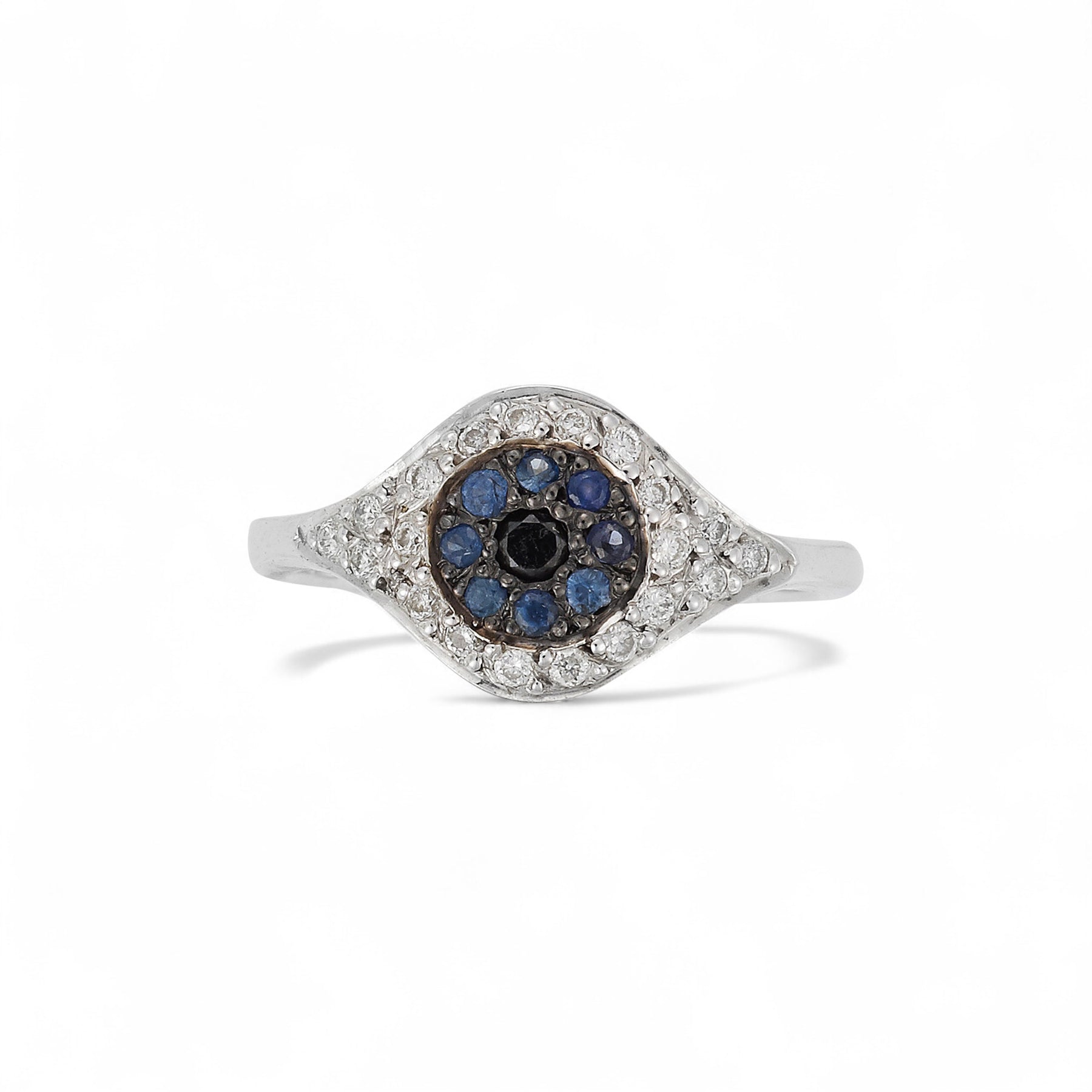 Boasting handcrafted 18-karat white gold and set with white diamonds, blue sapphires and a black diamond center, the Cats Eye Ring is an impressive and elegant piece. A true signature of Ileana Makri, this standout ring will elevate any outfit and provides a luxurious finishing touch.