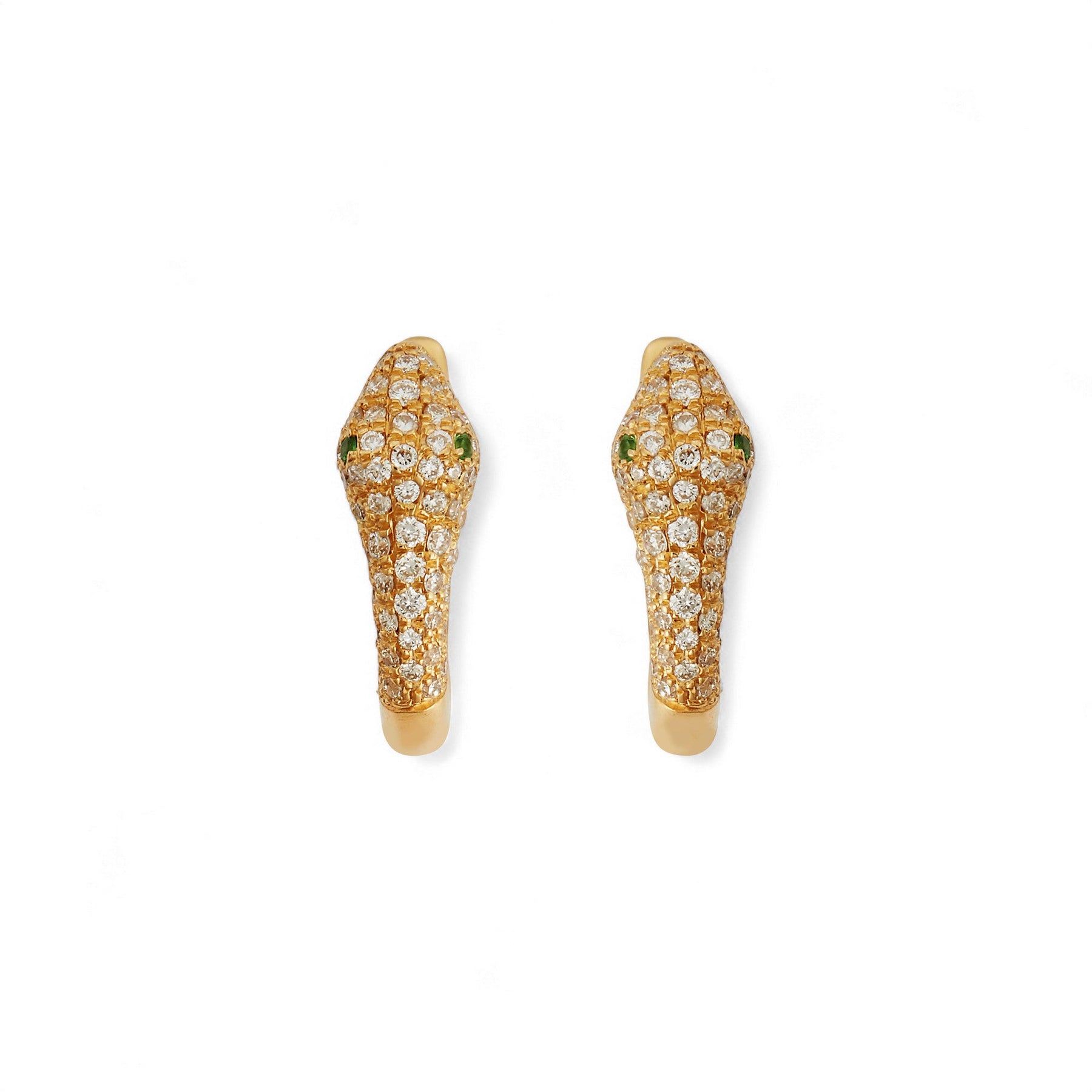 Delicate and enchanting, these Baby Boa Huggies earrings are a refined interpretation of nature’s elegance. Their petite size and snake-inspired design make them a perfect touch of understated charm. The shimmering white diamonds and vivid green tsavorites add a captivating detail, reminiscent of the boa’s striking eyes. Lightweight and dainty, these earrings feature a secure post-back closure for pierced ears, offering subtle sophistication for everyday wear or special occasions.