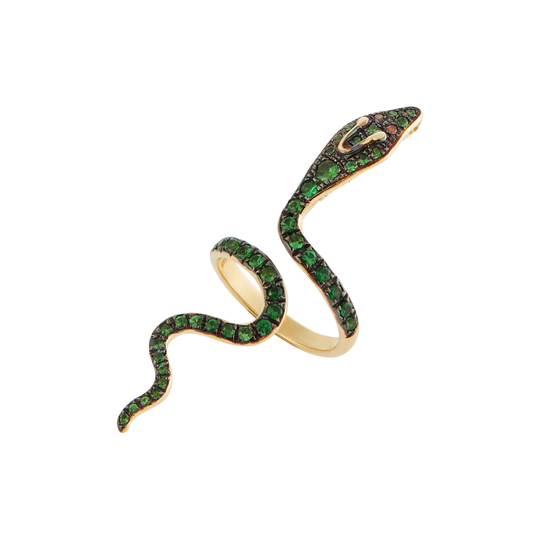 Striking and sinuous, the Cobra Ring coils around the finger with hypnotic grace. Handcrafted in 18K yellow gold, this iconic Ileana Makri design features vibrant green tsavorites set in oxidized gold for dramatic depth. Burgundy diamond eyes add a fierce and captivating touch to the serpent’s gaze. A powerful symbol of transformation and protection, this one-of-a-kind piece blends myth with modernity.