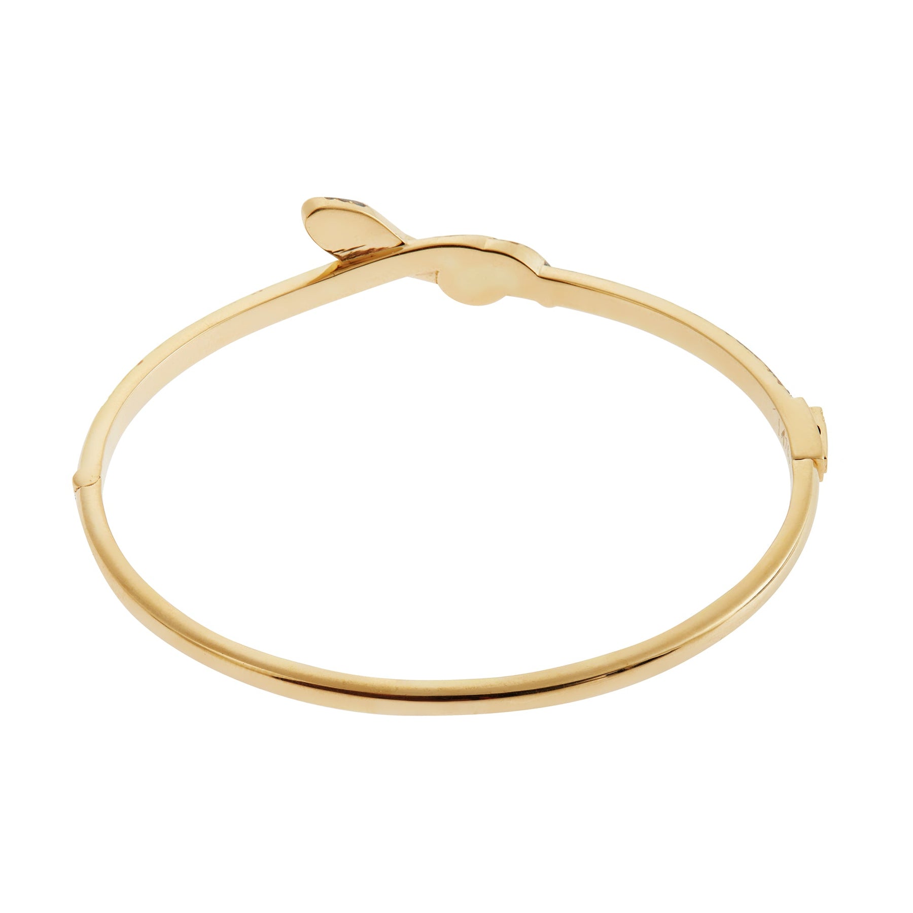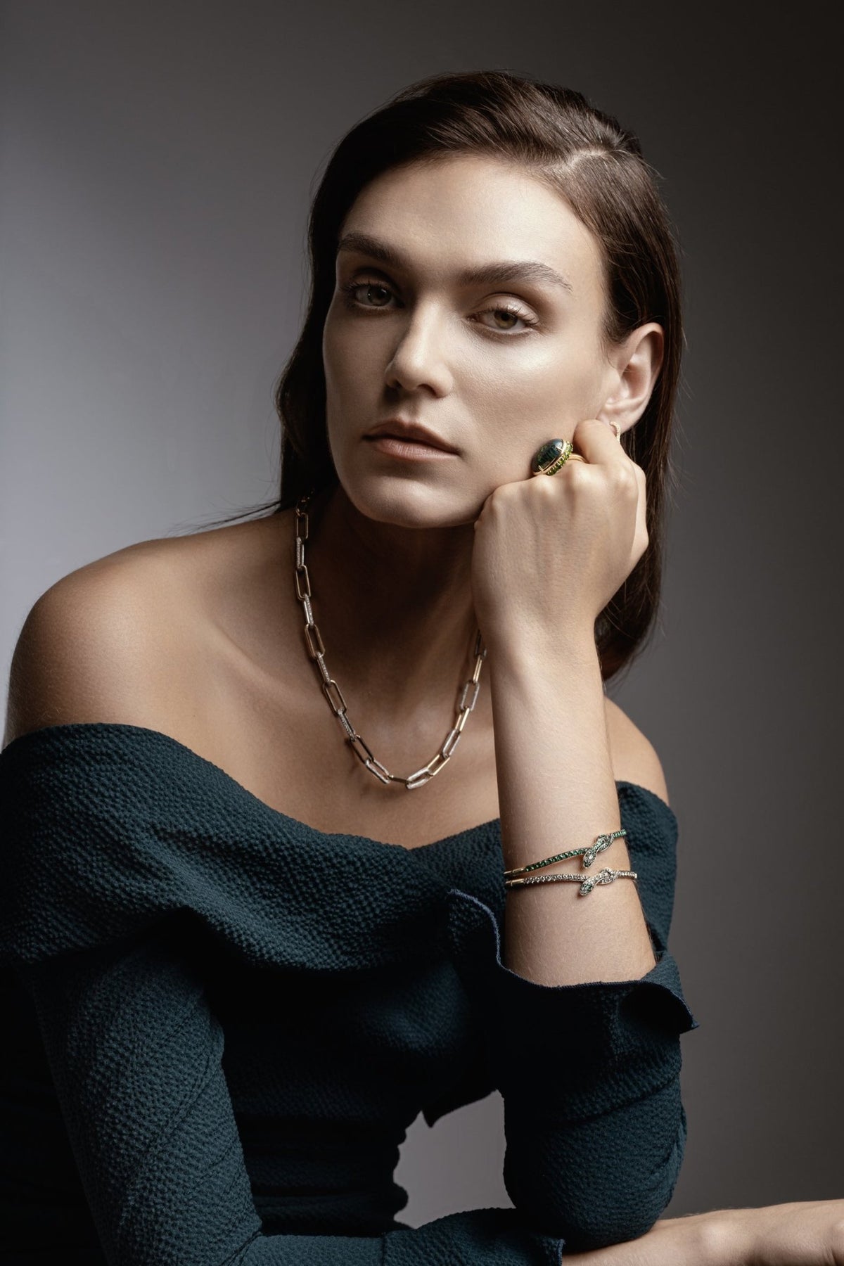 The Coiled Snake Emerald Bangle in timeless 18K yellow gold is a majestic accessory for the wrist. The emeralds encircling the snake's body, with light champagne diamond eyes, offer a luxurious aura. This exclusive bangle is a one-of-a-kind addition to any ensemble.
