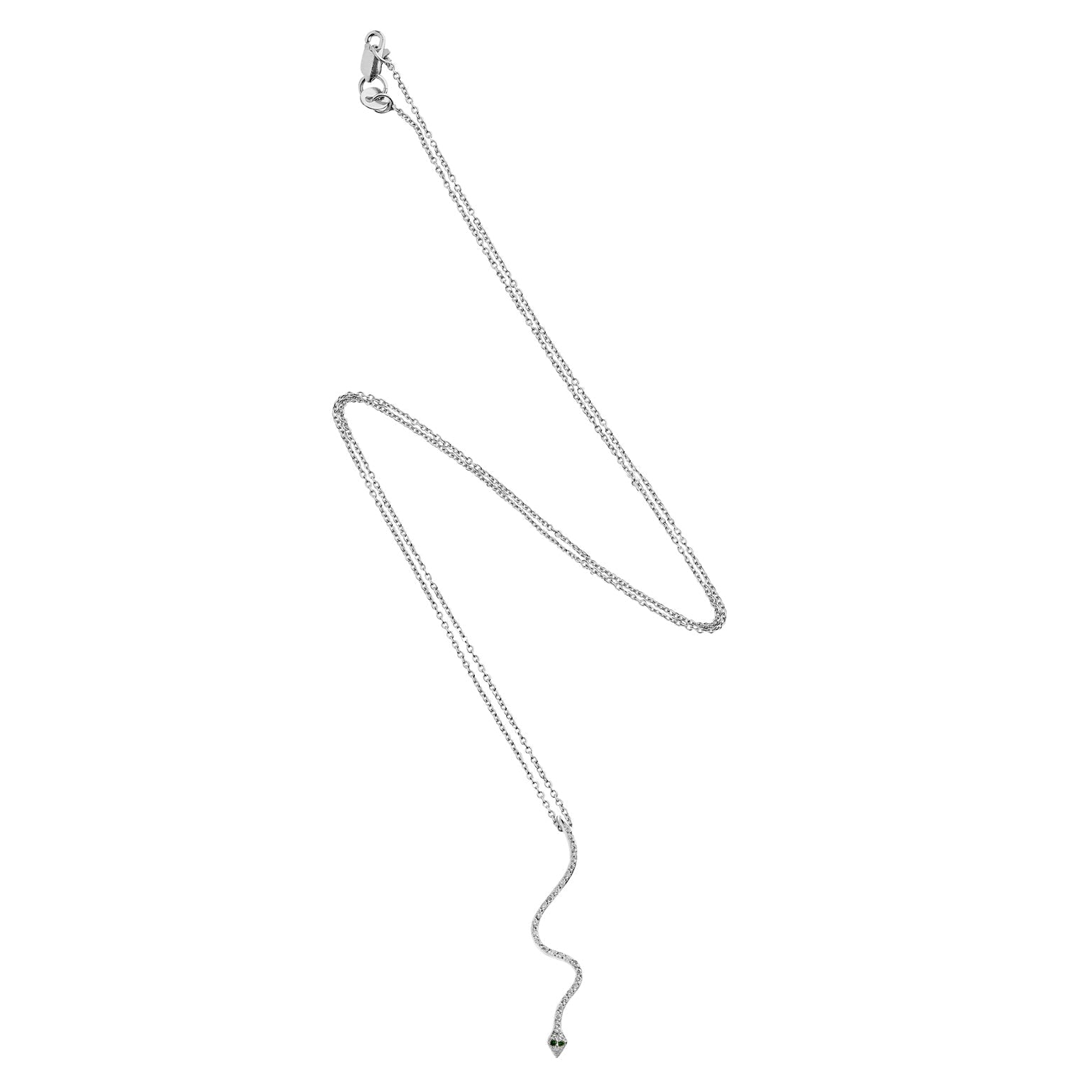 Elegant and enchanting, Ileana Makri’s Lucky Snake Lumina Pendant reflects timeless sophistication and protection. Handcrafted in 18k white gold, this graceful design is adorned with pavé-set white diamonds and vivid tsavorite eyes that bring the serpent’s form to life. A striking blend of fluidity and brilliance, the Luminous Pendant embodies the enduring allure of transformation and light.