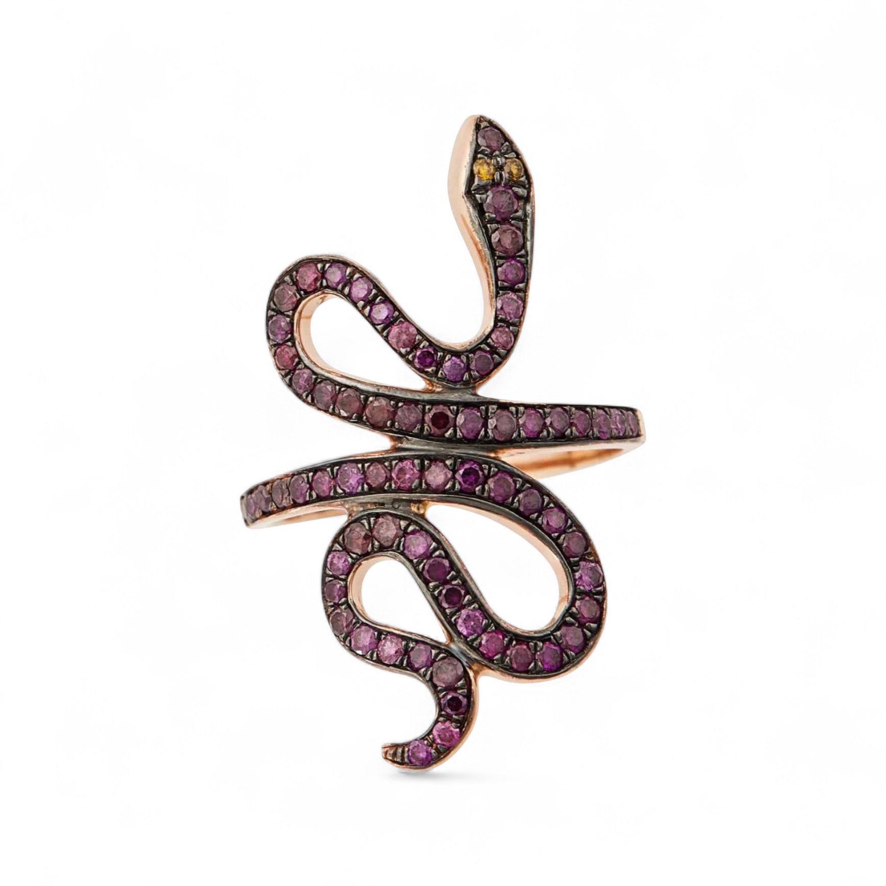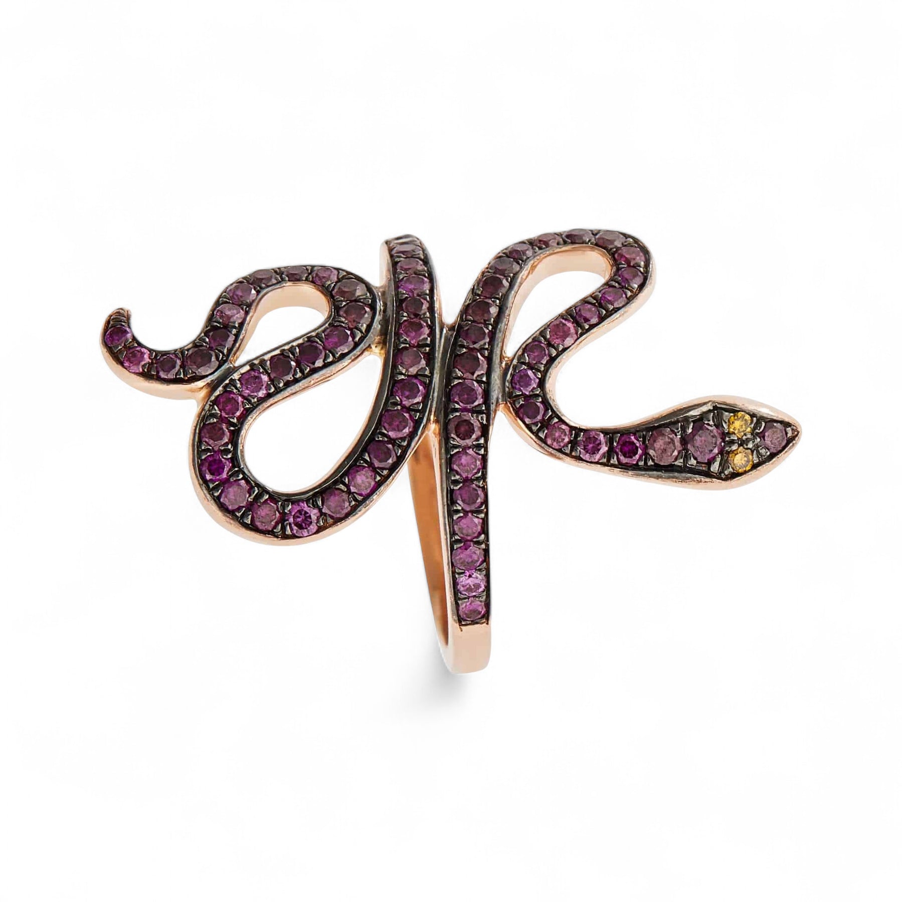 A signature Ileana Makri creation, the Slither Snake Ring coils sensually around the finger, embodying transformation and vitality. Handcrafted in 18k rose gold and set with pavé purple diamonds and yellow diamond eyes, the design glows with both mystery and magnetism. The oxidized finish accentuates the gemstones’ rich tones, creating a striking interplay of depth and light. A timeless talisman of power and renewal, this sculptural piece is destined to enchant.