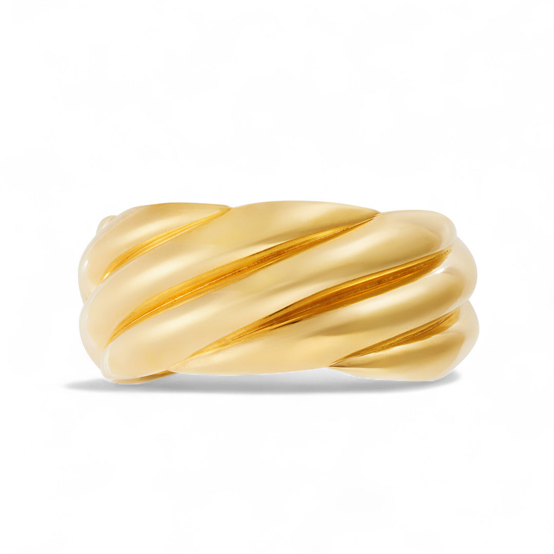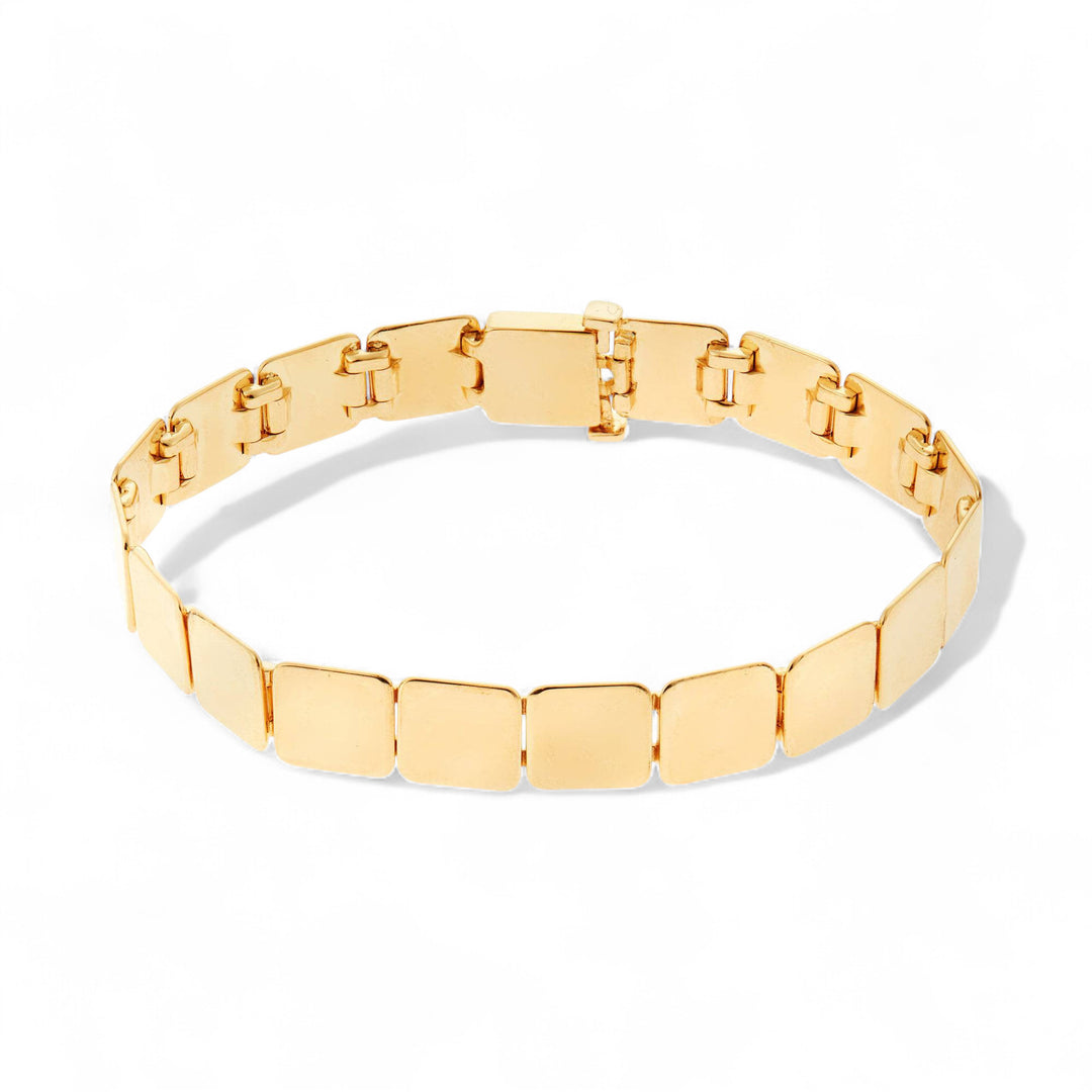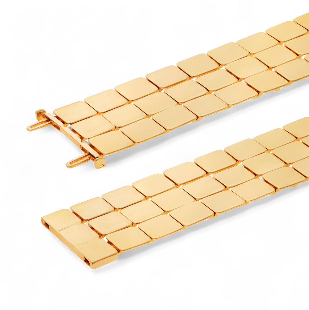 This handcrafted collection features 18k gold miniature tiles of varying sizes, fused together with fluidity, creating an endless sheet of opulence. Some pieces are adorned with baguette diamonds, resulting in an elegant design reminiscent of textiles.