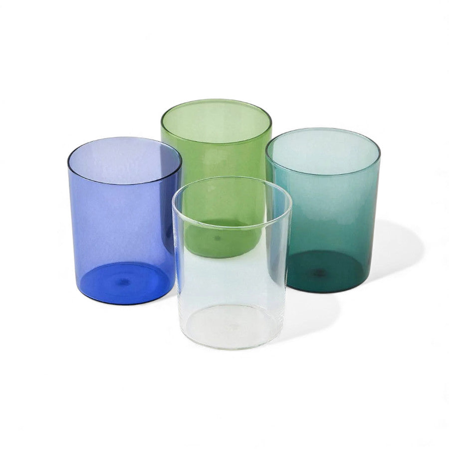 4 Large Gobelets by Maison Balzac. These four drinking tumblers are each hand crafted from a mix of teal, azure, green and clear borosilicate glass. A timeless design for everyday and special occasions alike, each tumbler adds extraordinary pleasure to the simple act of sipping your favourite drink.