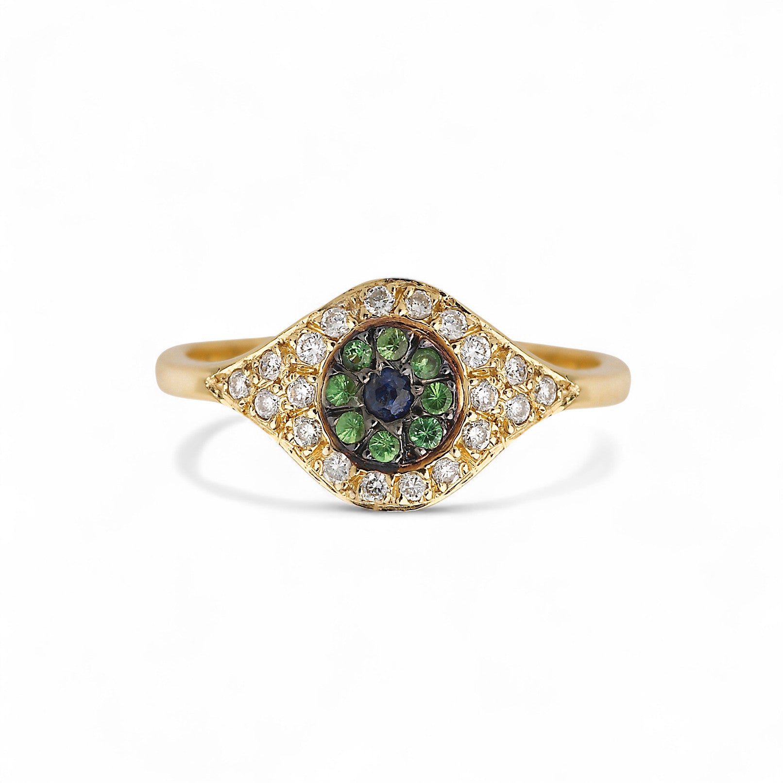 Inspired by the power and mystery of the cat's eye, this exquisite 18-karat yellow gold ring features a captivating combination of white diamonds, tsavorites and blue sapphire centre. Perfect for adding a touch of luxury and elegance, this signature piece from Ileana Makri will add a touch of timeless beauty to any look.