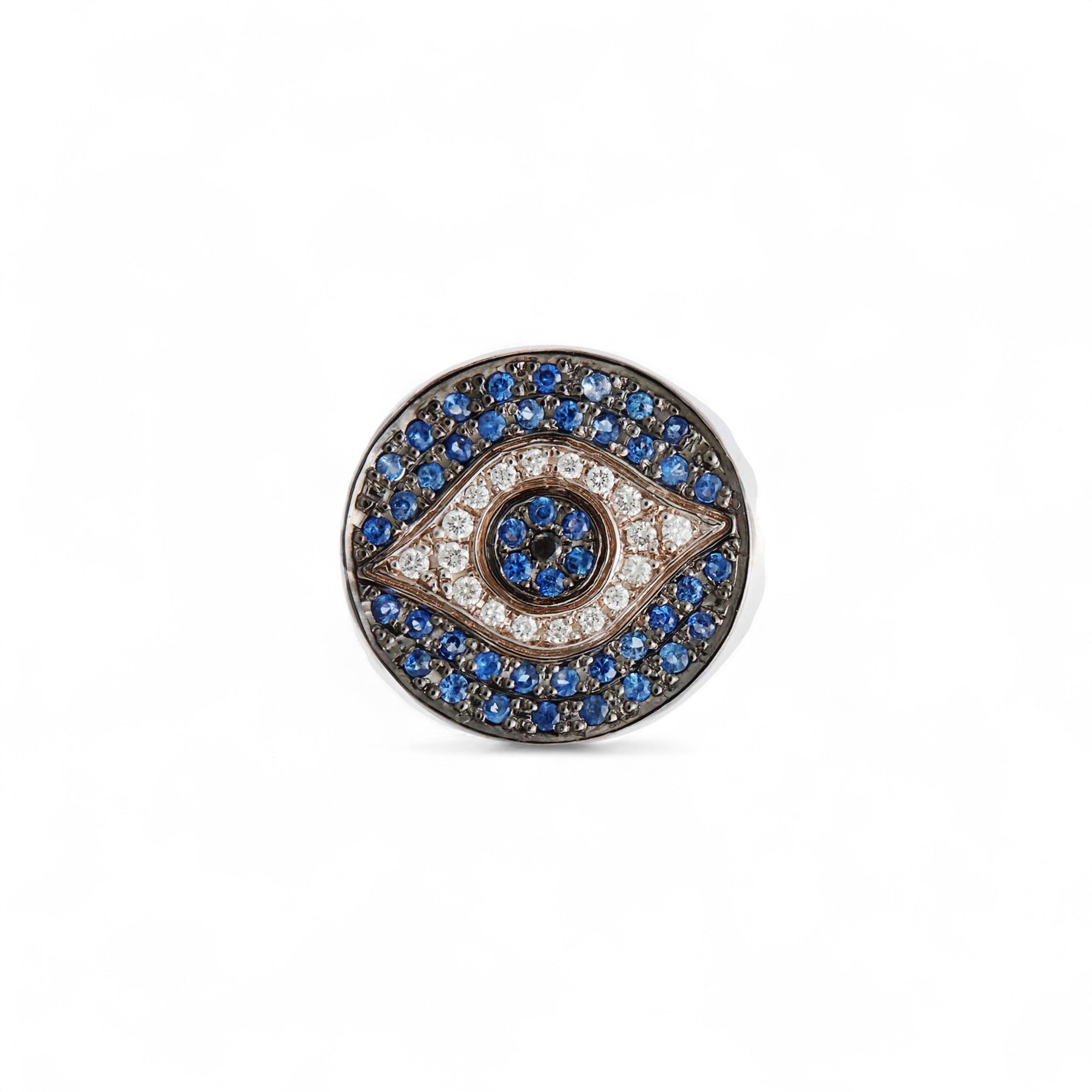 Fashioned with exquisite craftsmanship, this Little Dawn Chevalier Ring makes for a timeless piece of jewelry. Meticulously hand-cast from 18k white gold and oxidized on the surfaces, this beautiful ring is set with a combination of glistening white diamonds, shimmering blue sapphires, and a single deep-black diamond that gleam with elegance. Make a statement and wear it as a signet on your pinky.