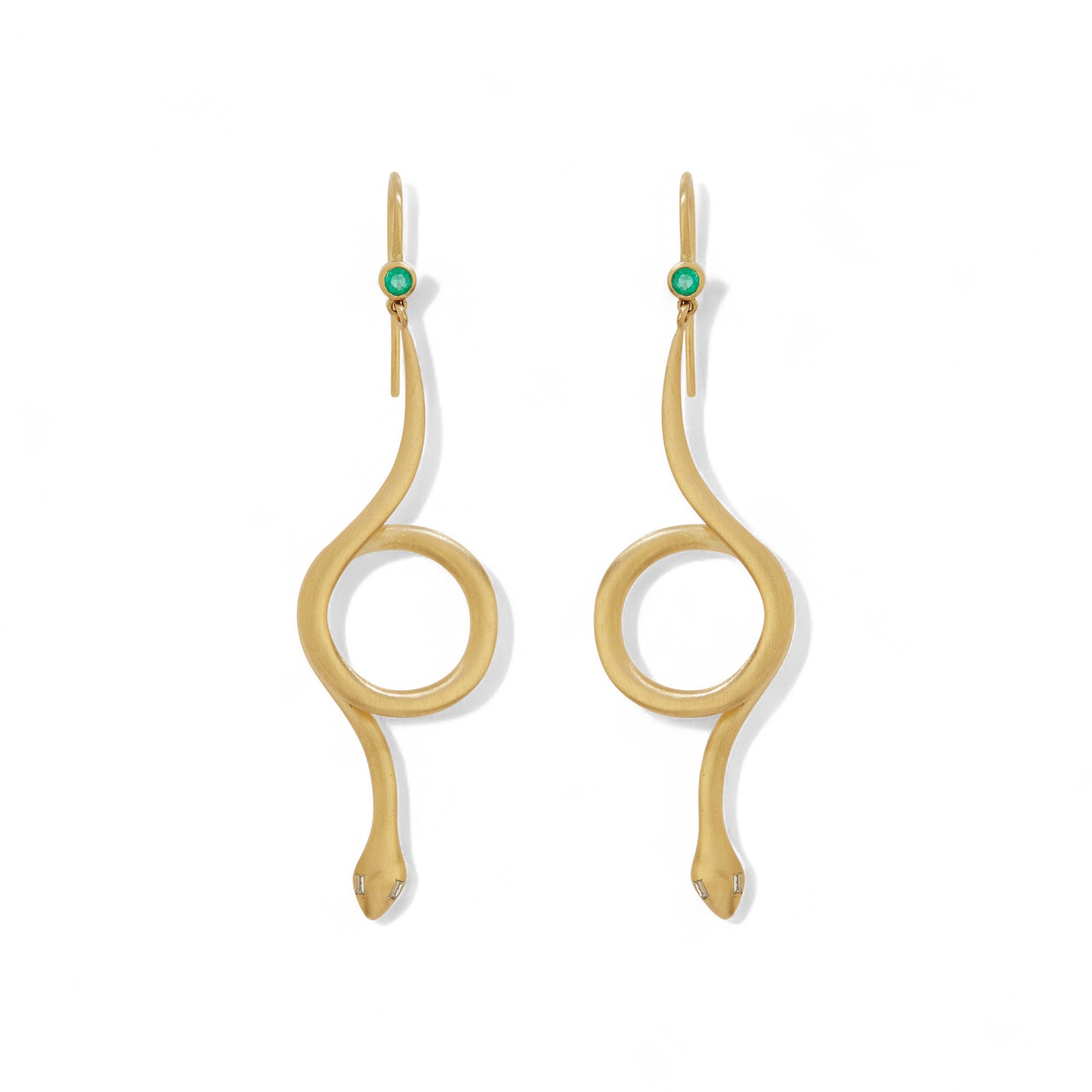 Crafted in 18k yellow gold with a smooth satin finish, the Serpent Loop Gold Earrings embody elegance with a symbolic edge. Suspended from delicate hooks set with vivid emeralds, each serpent curves into a graceful loop — a symbol of infinity and transformation. Sleek and sculptural, their eyes are finished with baguette-cut white diamonds, adding a subtle glint of light. A modern talisman, alive with movement and meaning.