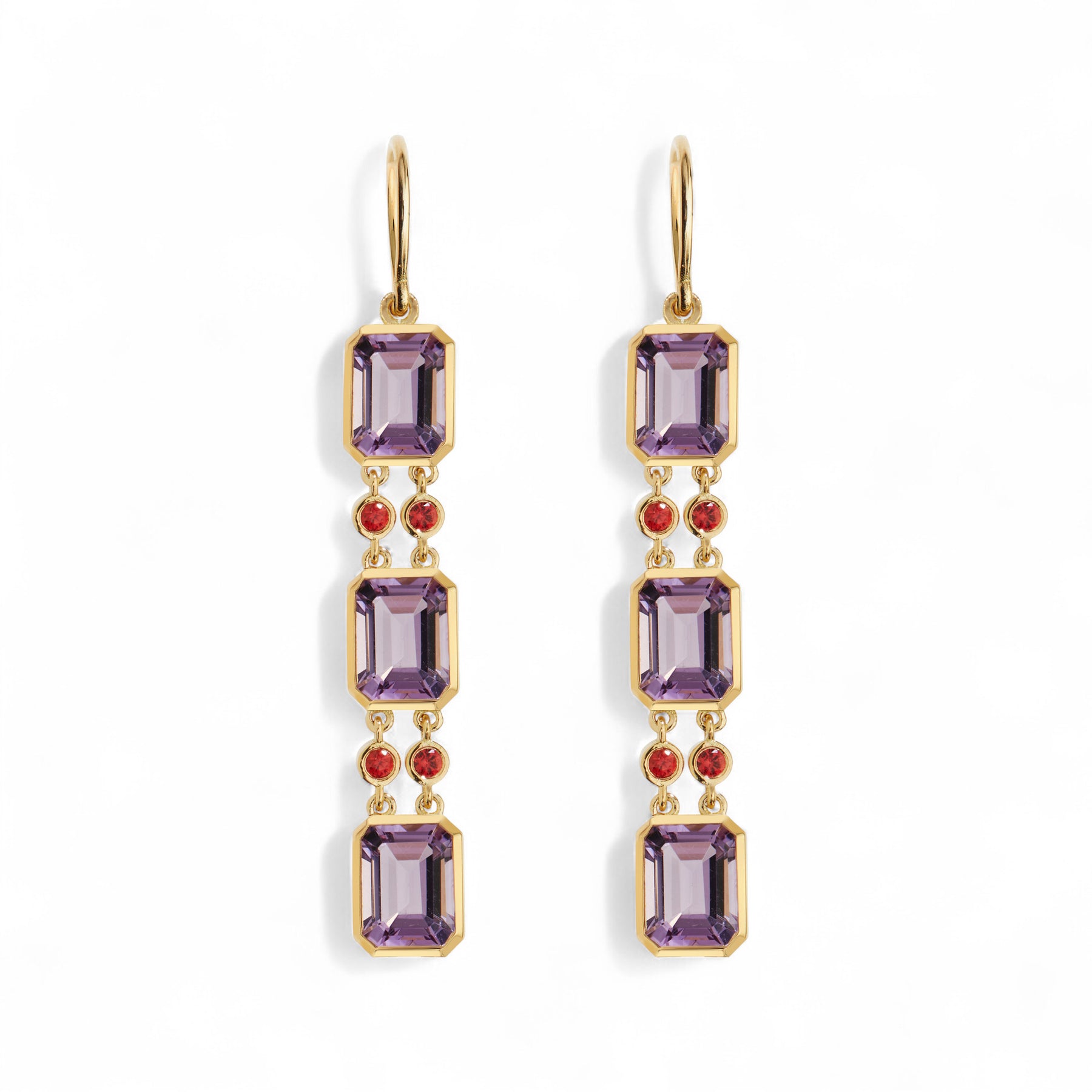 Romantic and radiant, the Sofia Amethyst Drops feature three emerald-cut pink amethysts paired with fiery orange sapphires in 18k yellow gold. This expressive design evokes harmony through contrast — delicate color meets bold brilliance in a fluid, sculptural form.