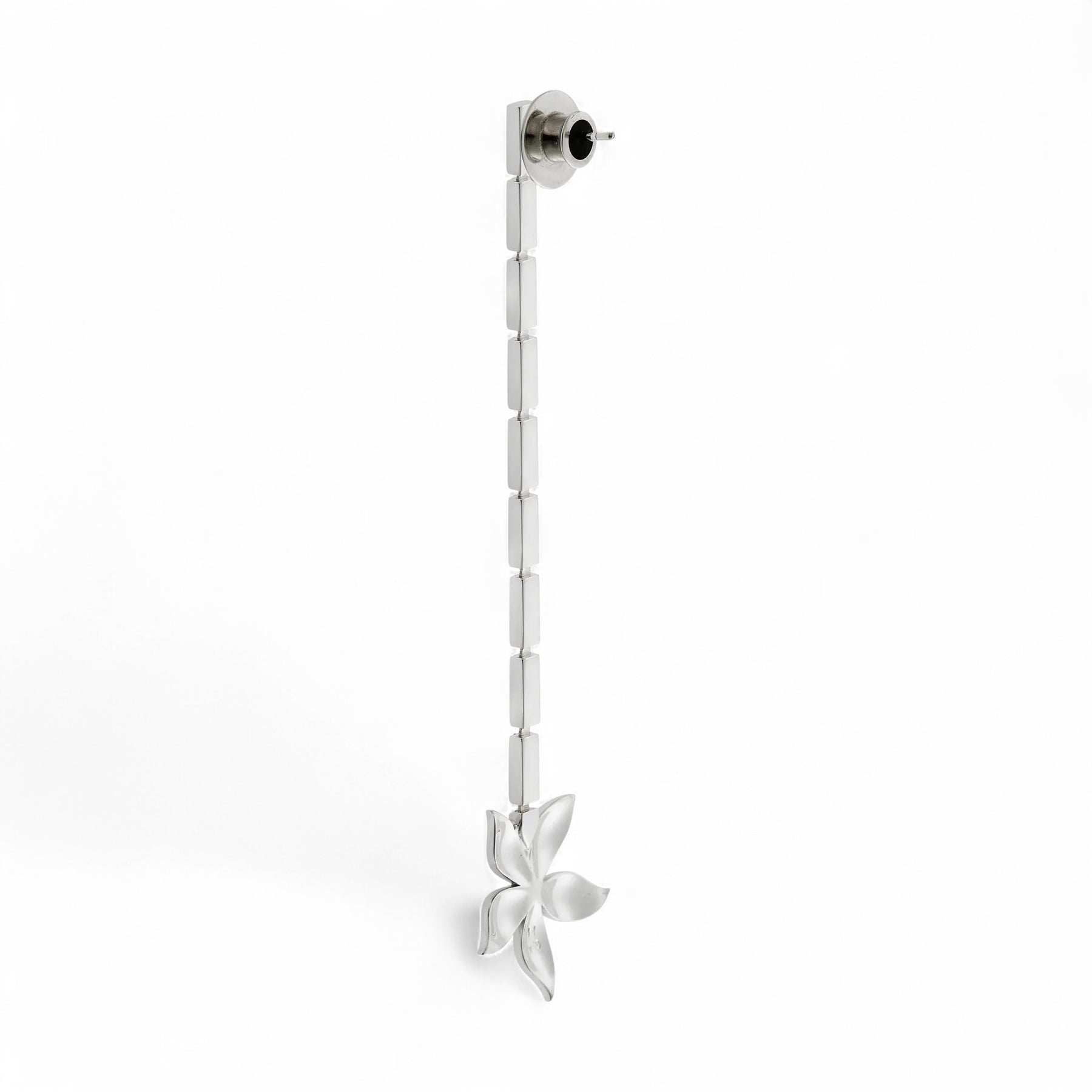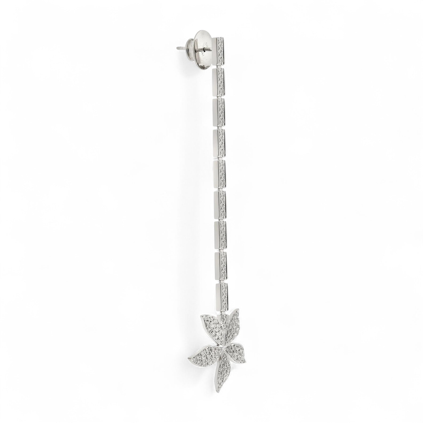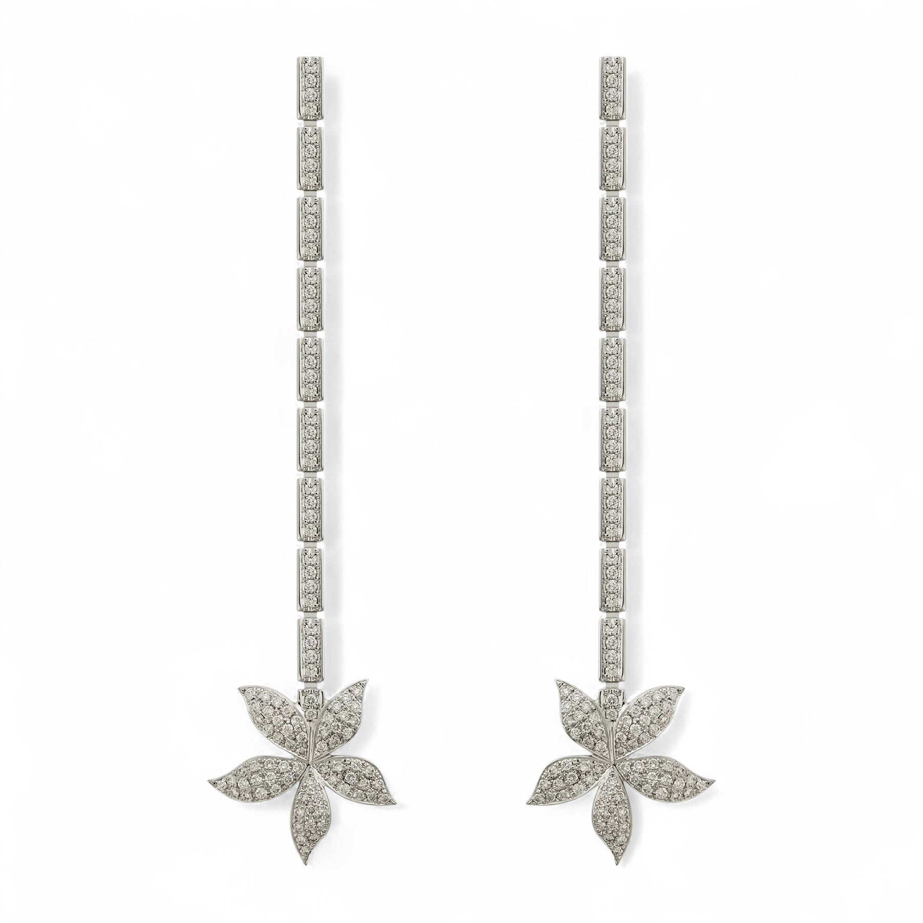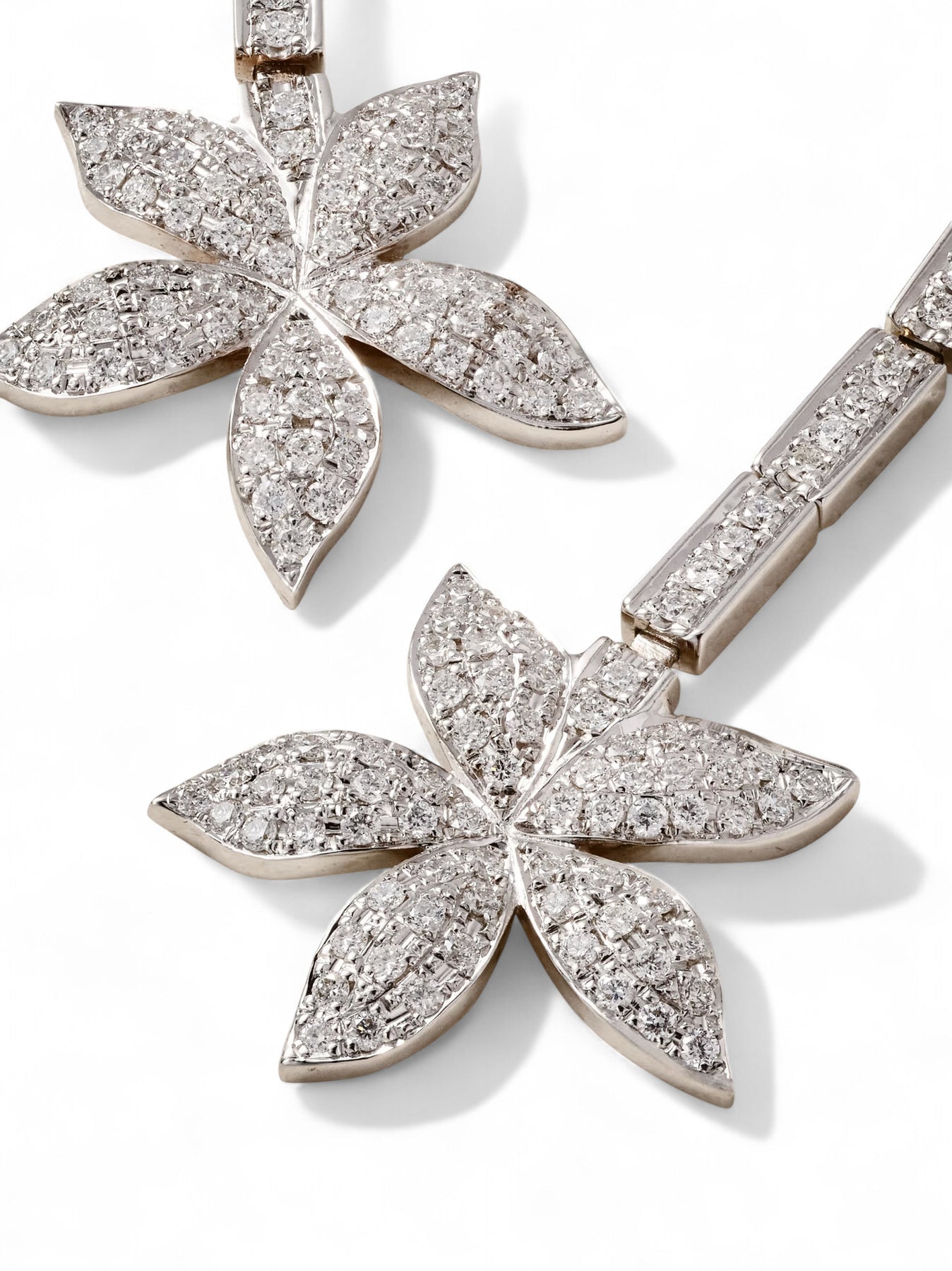 Introducing the Ripple Blossom Earrings. Handcrafted in 18k gold, they feature pave diamond bars hinged together to give it it's graceful movement - inspired by blooming flowers on the side of river beds, they feature two blossoming flowers adorned with pave white diamonds.