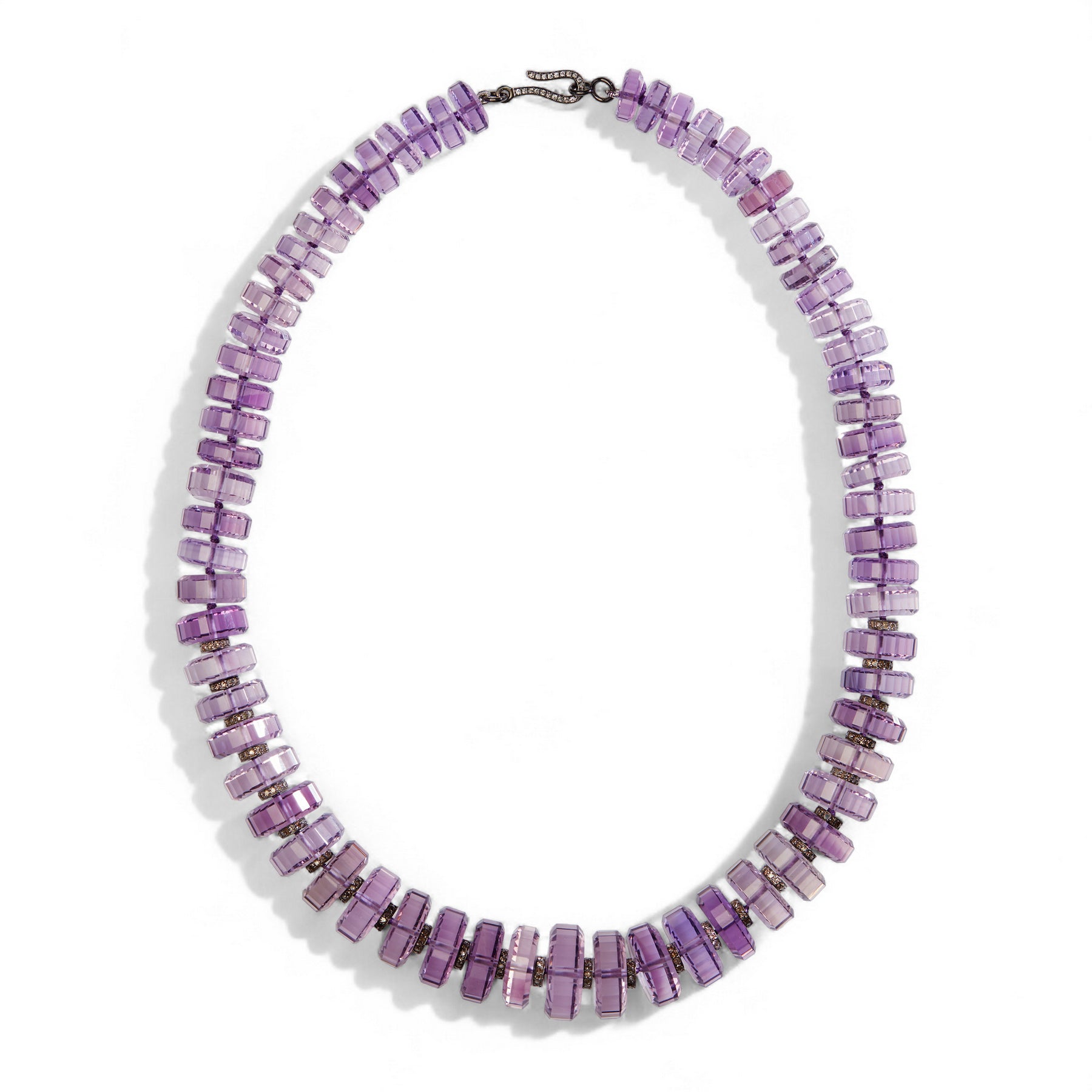 The Aura Pink Amethyst Necklace is a serene symphony of color and light. Handcrafted with faceted pink amethyst beads, this luminous strand reveals soft violet hues that shift gracefully in the light. Each bead is delicately spaced with oxidized sterling silver motifs set with grey diamonds, and finished with an 18k white gold oxidized clasp. A refined statement of modern femininity and timeless craftsmanship.