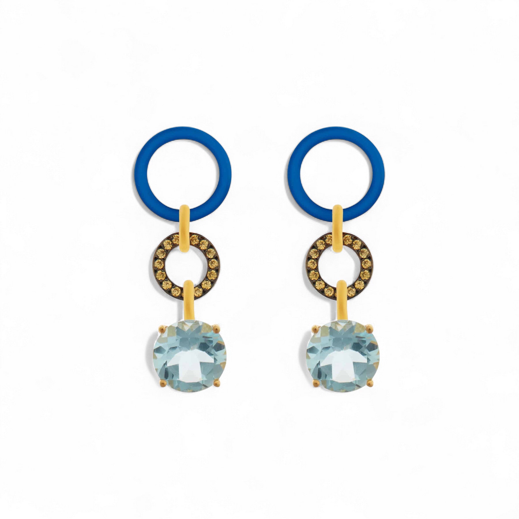 These twist earrings bring a sparkle of fun to any outfit! Handcrafted with sterling silver and 18K gold plating, they feature a circle stud adorned in blue enamel and a loop showcasing yellow crystals. To top it off, they have a glimmering twist of blue topaz drops. A twisted delight!