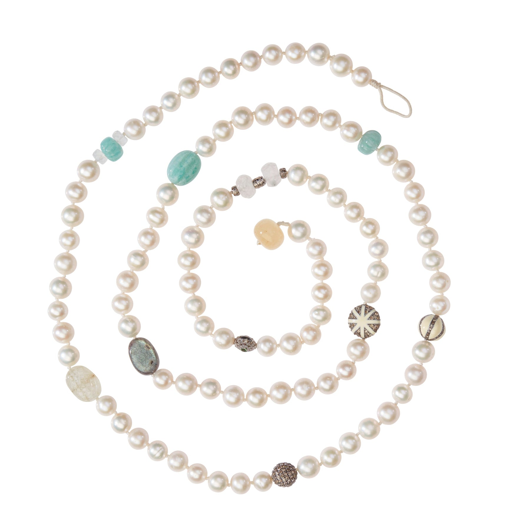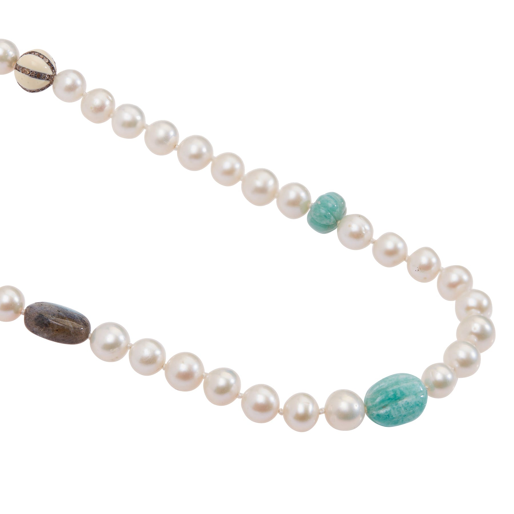 The Pearl Globetrotter Necklace is a celebration of journey and discovery, crafted with luminous pearls and an eclectic mix of semi-precious stones. At 95cm long, it can be worn as a single elegant strand or doubled for layered texture. Accented with hand-selected gemstones—including amazonite, moonstone, jasper, and labradorite—this piece also features sterling silver and enamel motifs set with grey diamonds, adding a hint of sparkle to its organic charm. A modern heirloom made for the adventurous spirit.