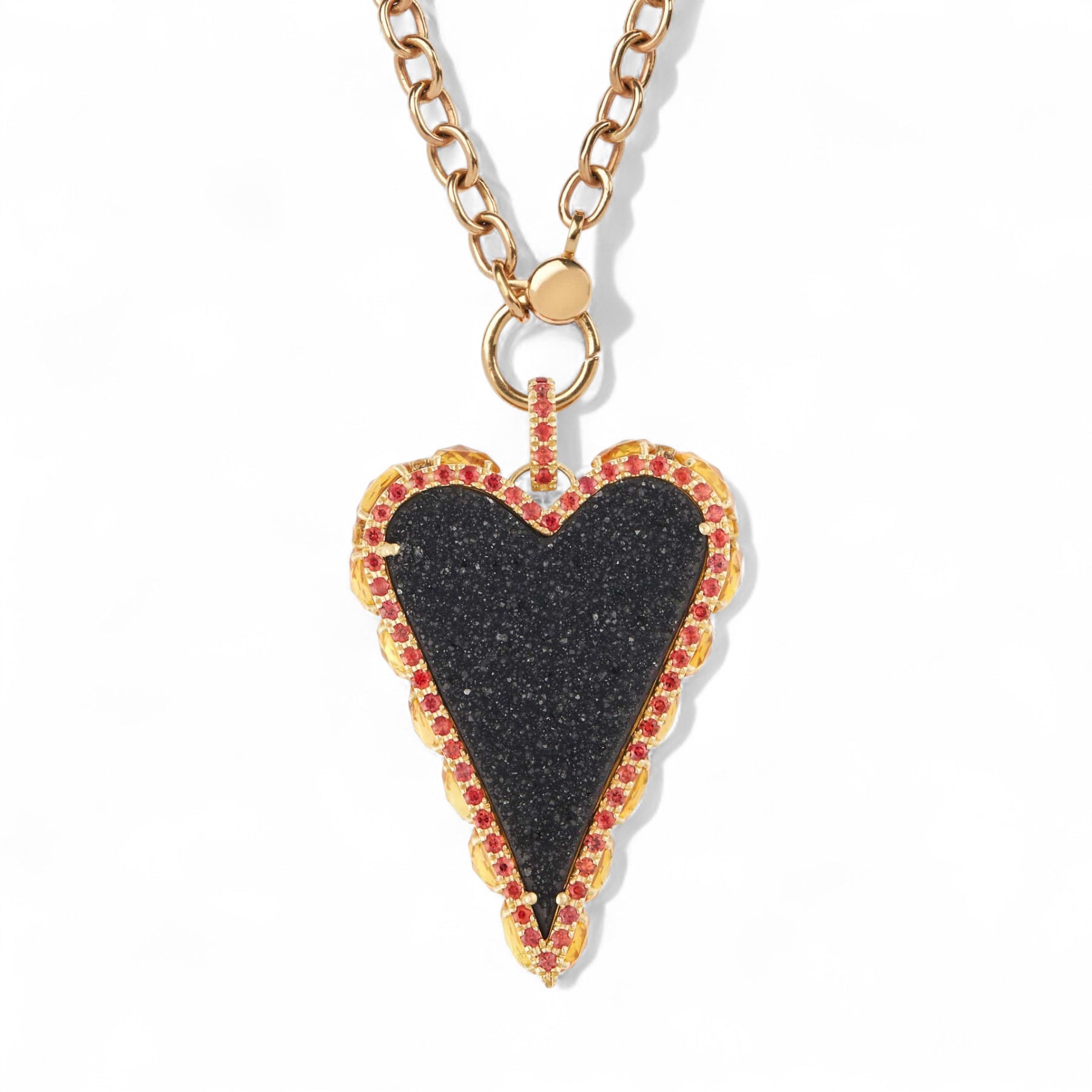 Bold, radiant, and irresistibly unique — Ileana Makri’s Mystery Love Pendant captures the allure of contrast and craftsmanship. Handcrafted from polished 18k yellow gold, this one-of-a-kind pendant features a heart-shaped black agate druzy whose velvety sparkle is framed by a vivid halo of orange sapphires. The heart’s sides are adorned with rose-cut orange sapphires, adding fiery depth and dimension to its sculptural form. A modern amulet of mystery and passion, this piece embodies the designer’s fascination with love’s dual nature — strength and vulnerability, light and shadow.
