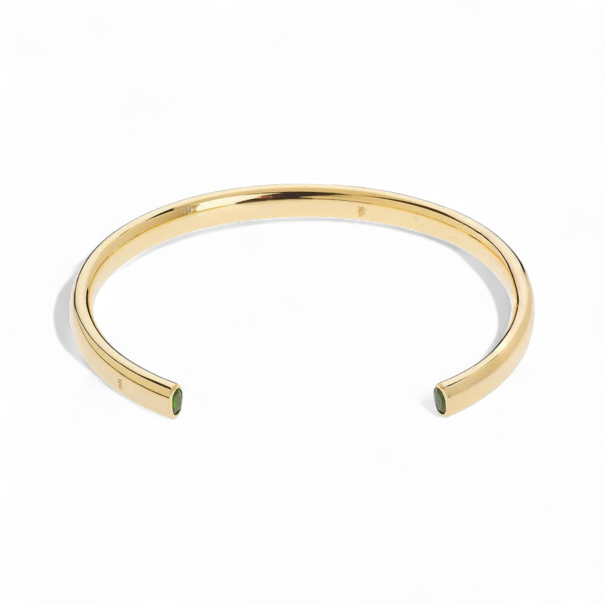 This "Oval" Pipe Cuff is designed in a timeless silhouette perfect for everyday wear. Made from yellow gold-plated bronze, this minimal style is simply detailed with sparkling diopside stones at each end. Stack yours with other slim bracelets.