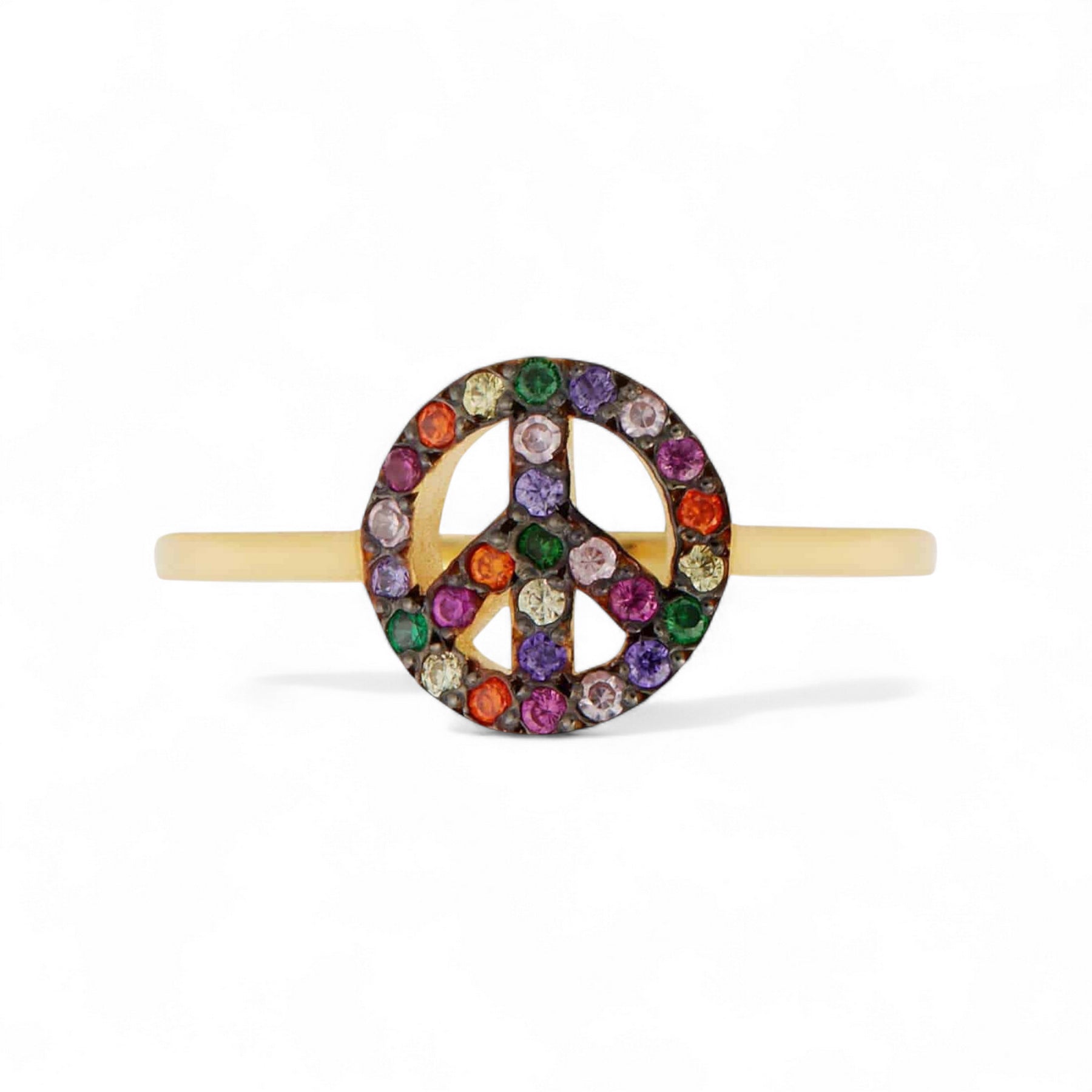 Unleash a little peace and love with this handcrafted Rainbow Peace Ring! Adorned with multicolor zircons and oxidized for added sparkle, the 18K yellow gold-plated sterling silver ring is a beautiful way to show your bright personality. Add a little 'oomph' to your look with a blast of rainbow-hued style!