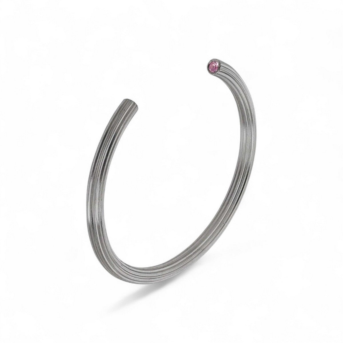 This Ribbed Pipe Cuff is designed in a timeless silhouette perfect for everyday wear. Crafted from oxidized sterling silver, this minimal style is simply detailed with sparkling pink sapphires at each end. Stack yours with other slim bracelets.