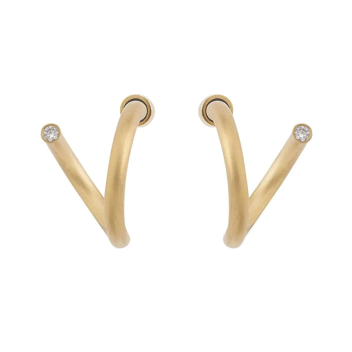 Handcrafted from 18k yellow gold plated bronze, these Round Pipe Hoops are slightly bended so that the sparkling set crystal sits under the lobe. Perfect for Every day.