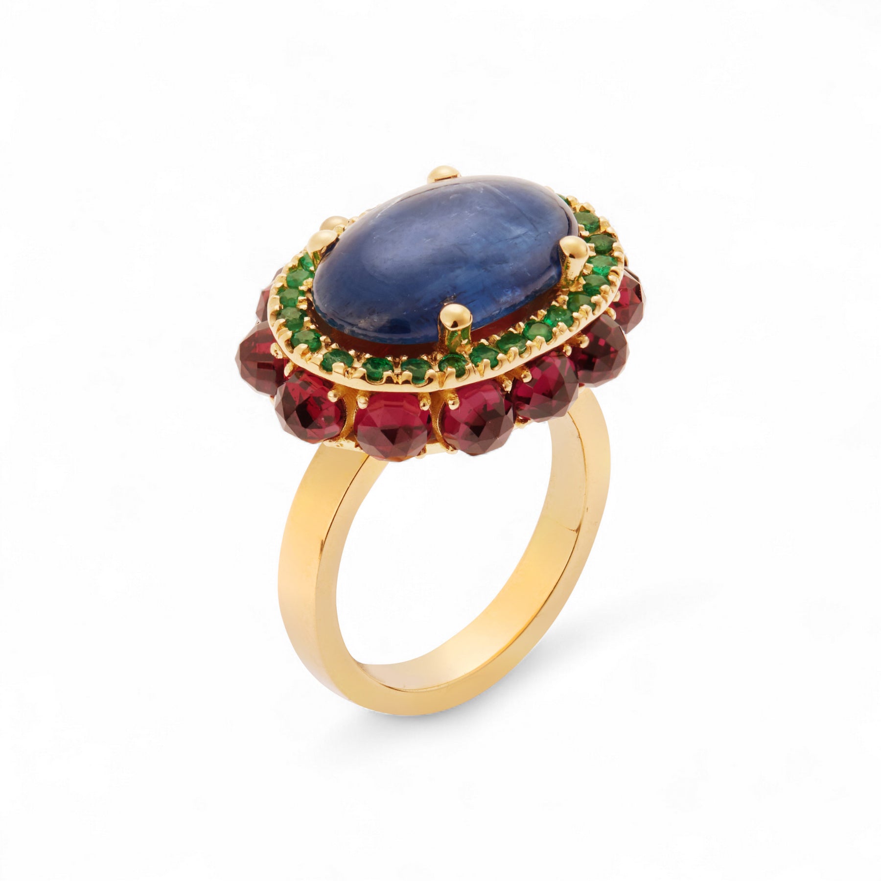 This Sea Eternity Flower Ring is an exquisite handmade 18k yellow gold statement piece. Featuring an eye-catching center oval kyanite in deep blue, surrounded by a halo of tsavorite and rosecut garnets, this luxurious 1920's-inspired ring is certain to turn heads.