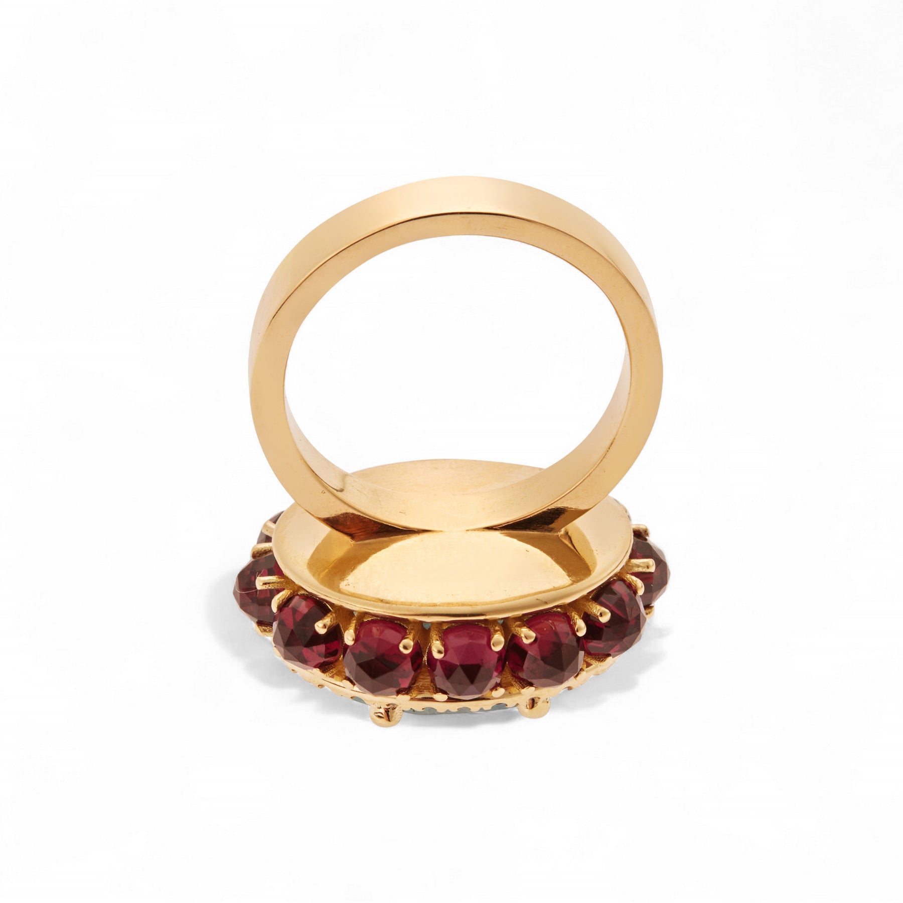 This Unique ring is inspired by the glamour and romance of the cocktail jewelry of the 1920's. Hand-cast from 18k gold, this one of a kind piece is centered with an Aquamarine, accented with a halo of blue Sapphires and set all around the side with Red Garnet.