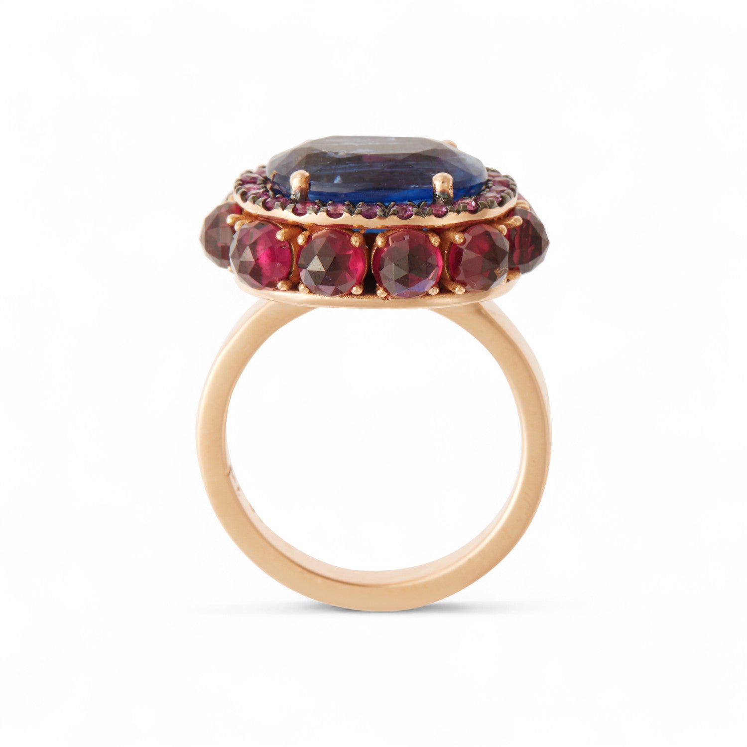 This Bespoke ring is inspired by the glamour and romance of the cocktail jewelry of the '20s. Hand-cast from 18k rose gold and oxidized on the stones, this stunning piece is centered with deep blue kyanite, accented with pink spinel and shiny rose cut garnet all around.