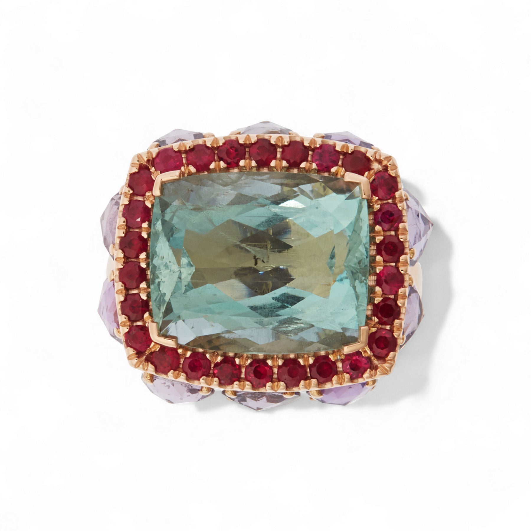 This Unique ring is inspired by the glamour and romance of the cocktail jewelry of the 1920's. Hand-cast from 18k rose gold, This one of a kind piece is centered with an Aquamarine, accented with a halo of rubies and set all around the side with Purple Rosecut Sapphires.