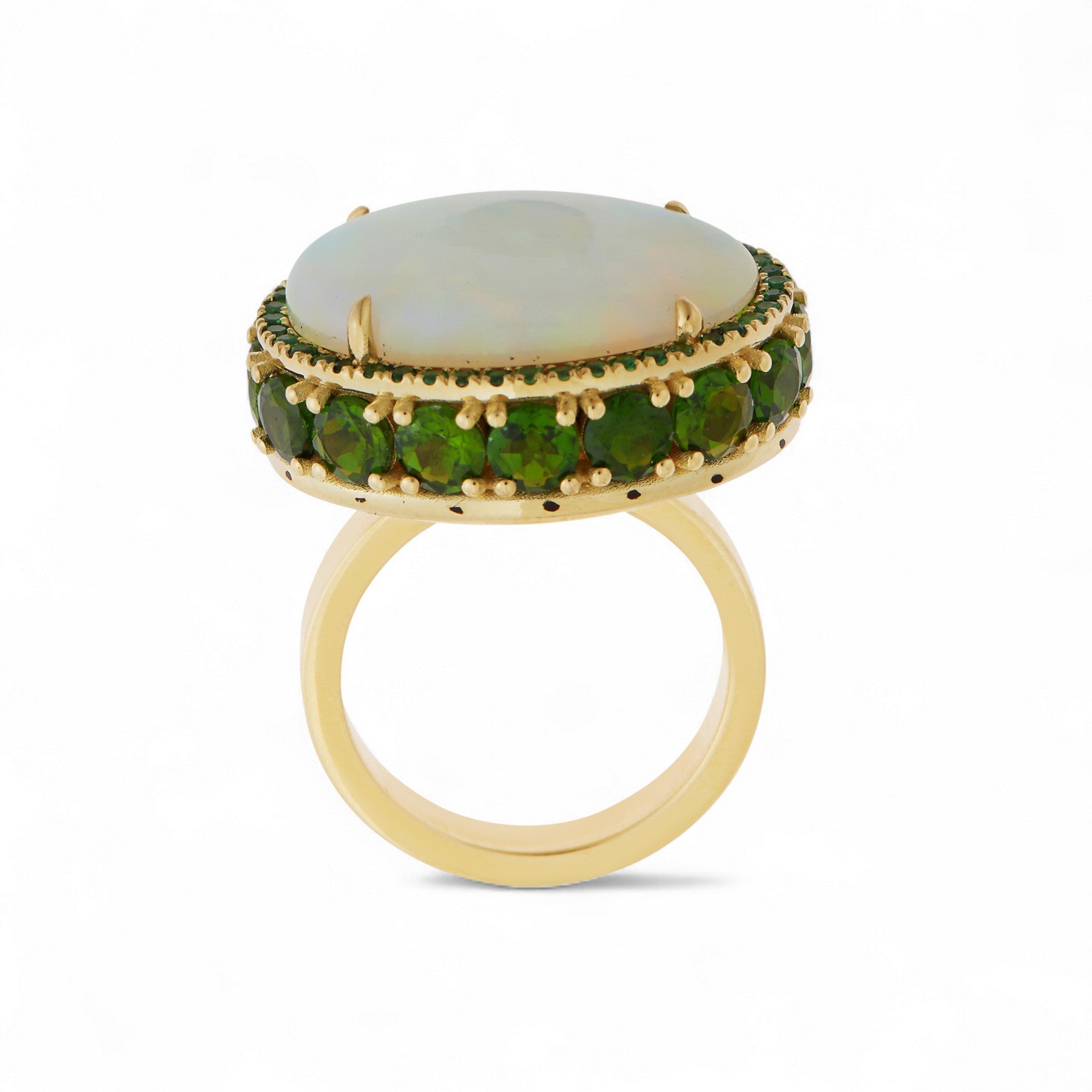 A one-of-a-kind creation that captures the essence of light and nature, Ileana Makri’s Ethereal Garden Opal Ring is a breathtaking statement of artistry and color. Handcrafted in 18k yellow gold, it features a luminous 7.74-carat Ethiopian opal at its center — a gem that shimmers with an enchanting play of hues. Encircling the opal, vibrant chrome diopside and tsavorite stones form a lush green halo, creating a striking contrast that evokes the beauty of a mystical garden after the rain. A piece of wearable poetry, this ring embodies both sophistication and wonder.